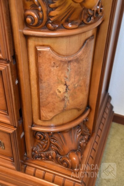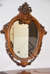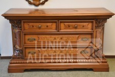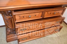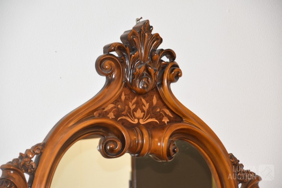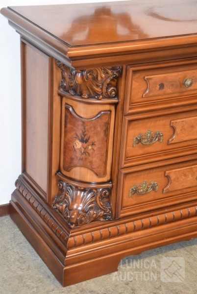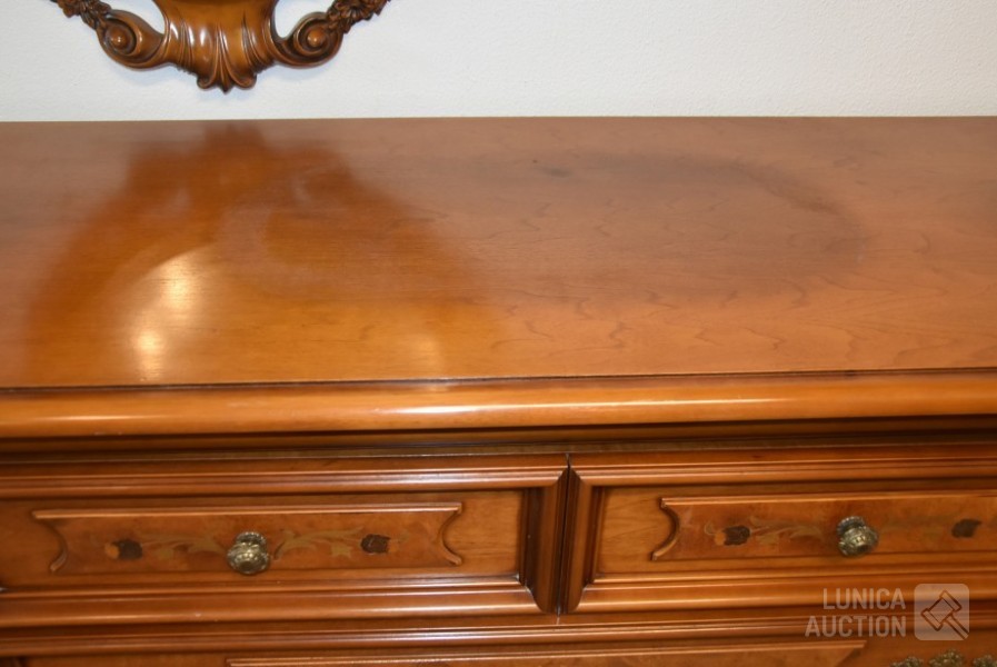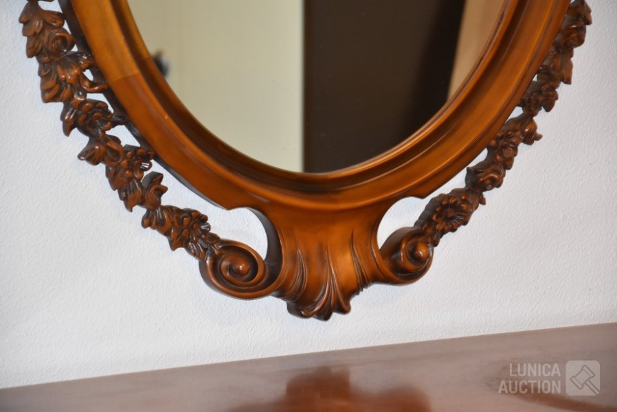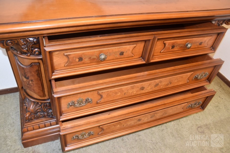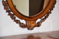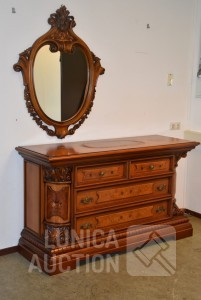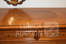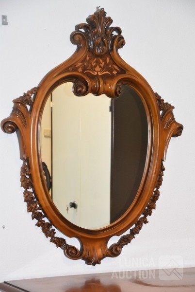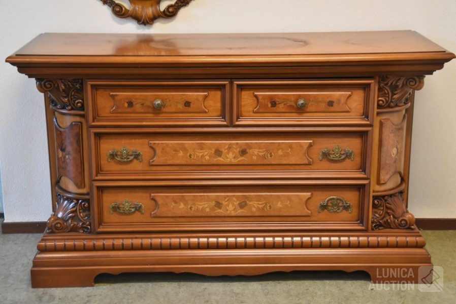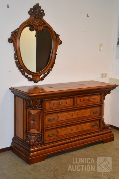 Afmeting dressoirkast (bxdxh) 165x58x94 cm., 4 laden; Barokke spiegel 90x110 cm. Bovenblad van dressoirkast heeft gebruikerssporen.