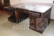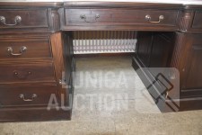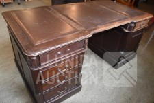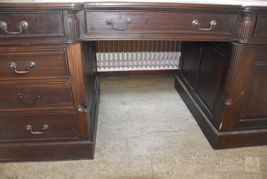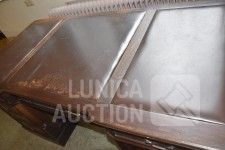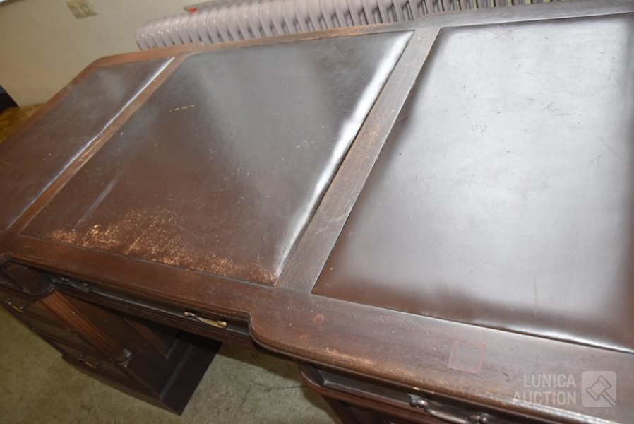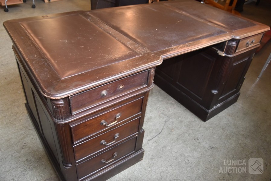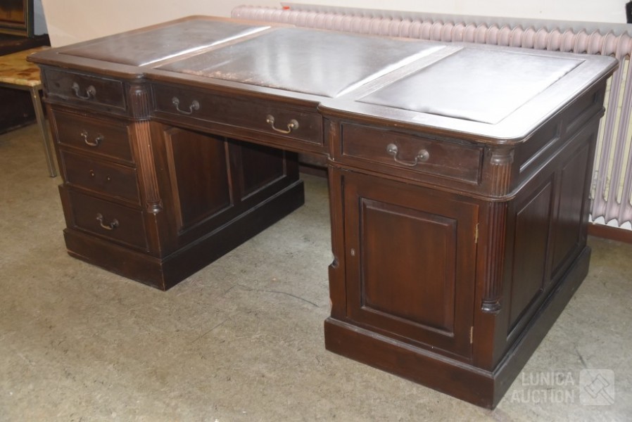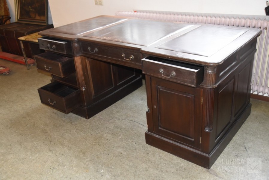 Aan beide zijden van bureau zitten laden. Kunstlederen schrijfgedeeltes. Afmeting (bxdxh) 180x90x79 cm Met gebruikerssporen, opknapper. Het bureau is demontabel in 3 delen.