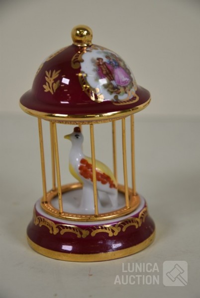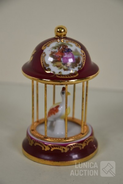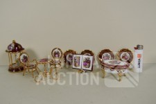 o.a. "vogelkooi", hoogte 10 cm; Miniatuur borden, doorsnede 5 cm; Boekenstandaard, hoogte 6 cm; Tafel en 2 stoelen, hoogte 6,5 cm en 6 cm; enz.