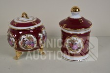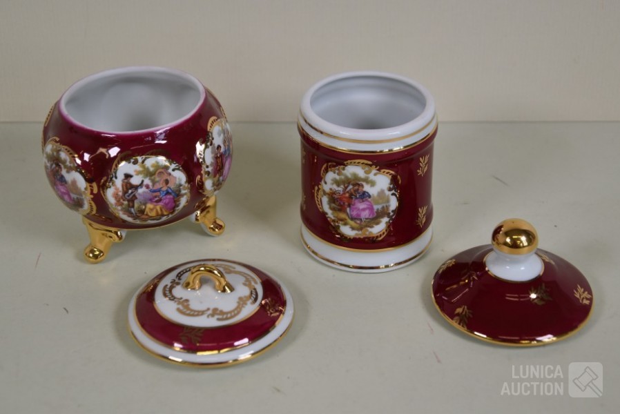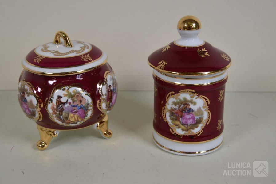 o.a. sierborden, doorsnede 11cm, 14 cm en 25 cm; 2 vaasjes, hoogte 15 cm; Opbergdoosjes, hoogte 10 cm en 13 cm