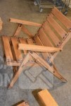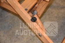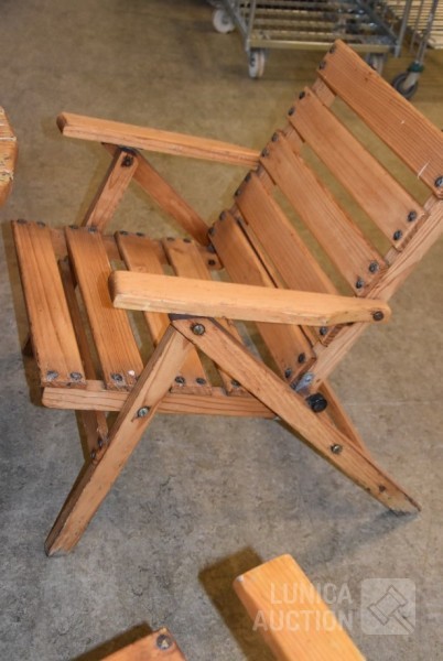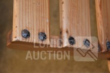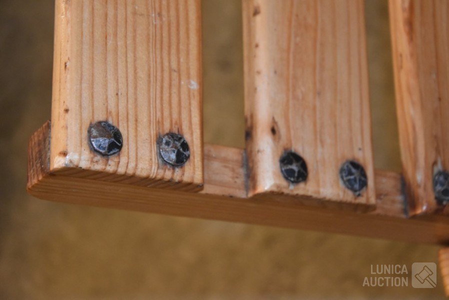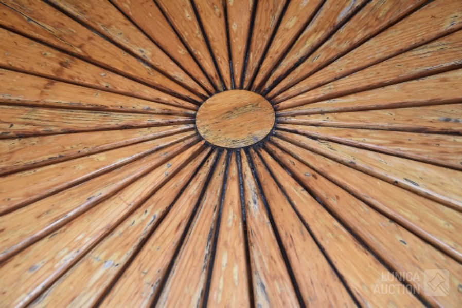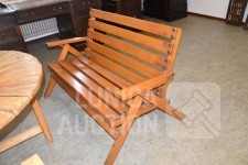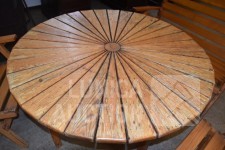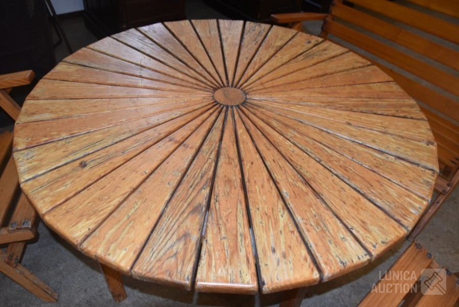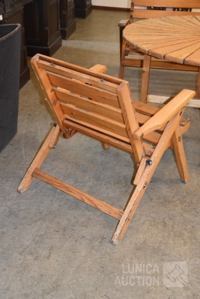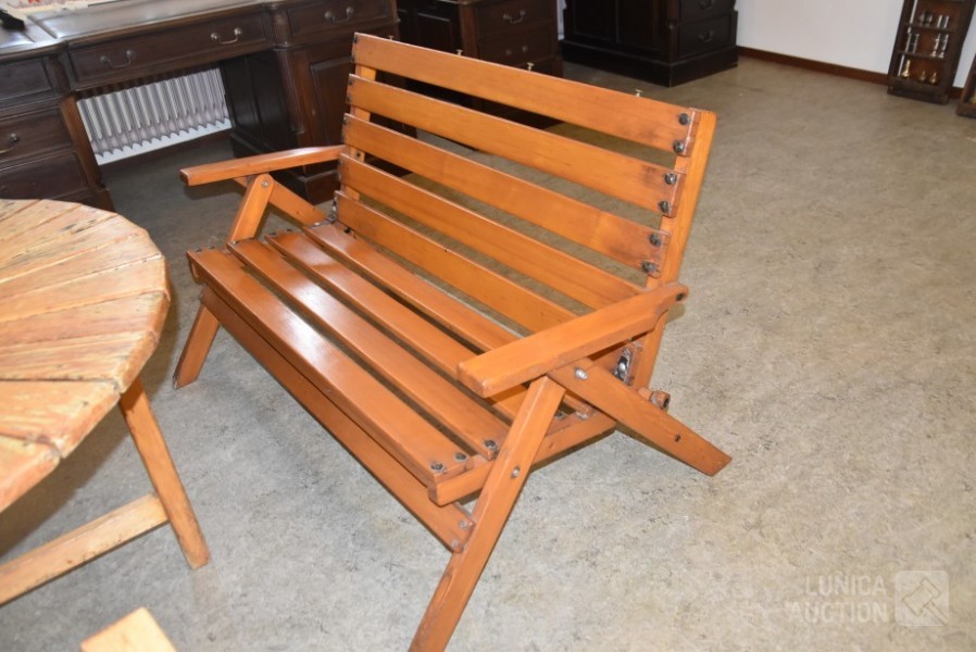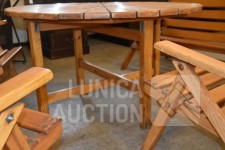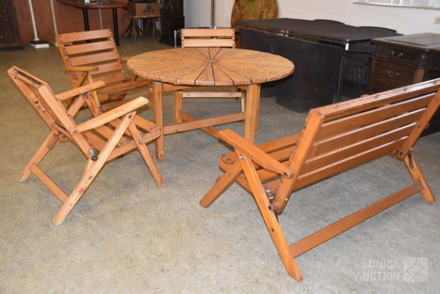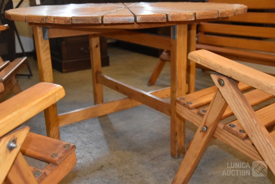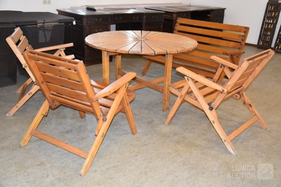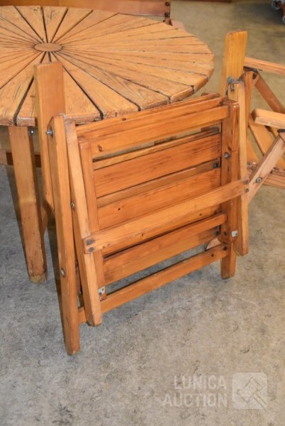 Pine hout, Tafel, doorsnede 122 cm, hoogte 70 cm; bankje, afmeting (bxdxh) 130x80x80 cm; Stoelen, 65x75x80 cm; Stoelen en bankje zijn inklapbaar; Met gebruikerssporen, mooie set.