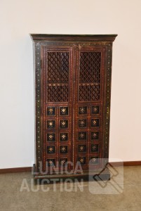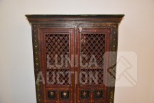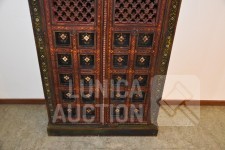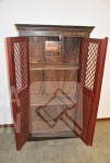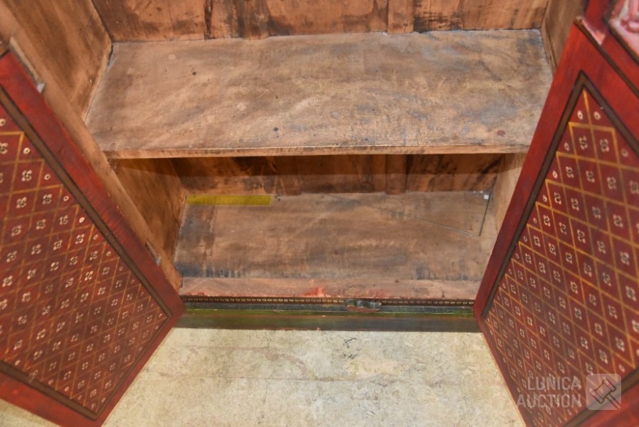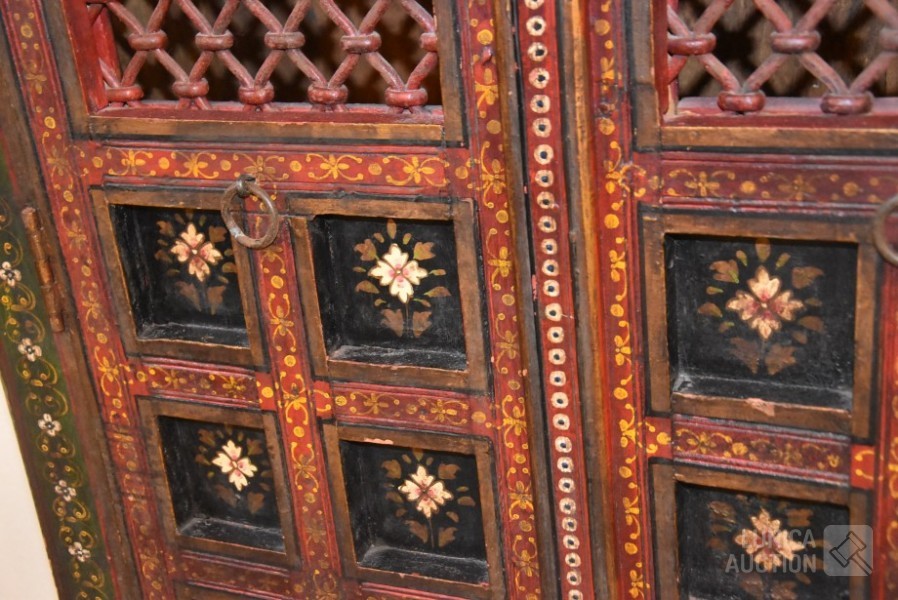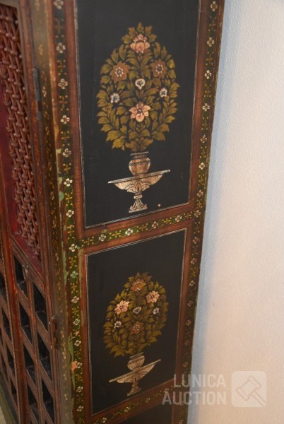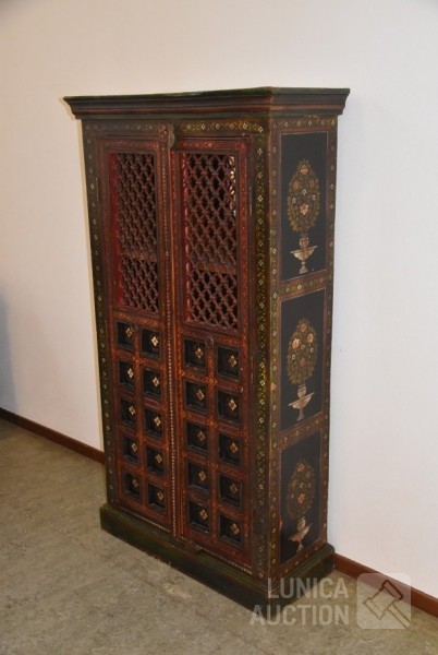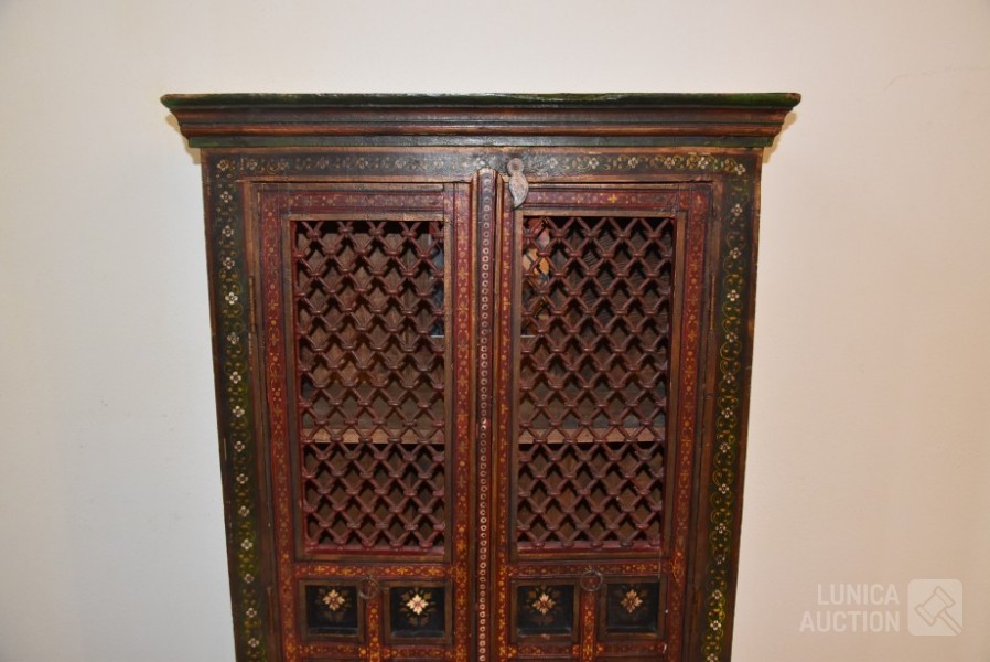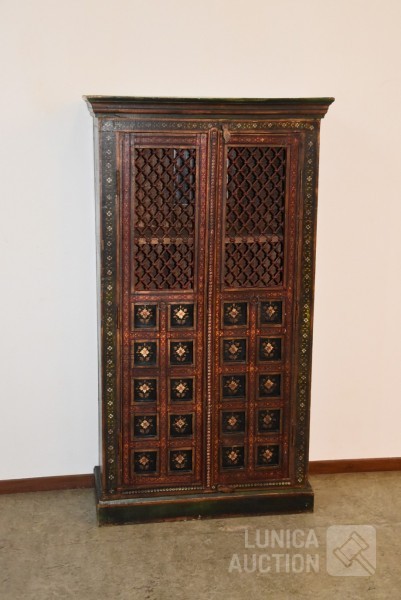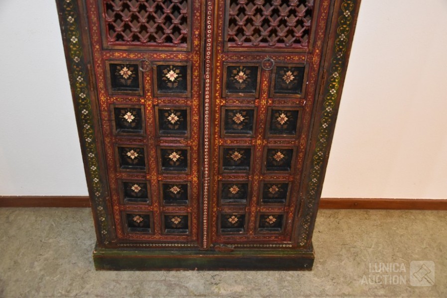 "Indiase kast", Handbeschilderd hout. Rasterwerk in de deuren is van smeedijzer. Afmeting (bxdxh) 83x34xc150 cm. Met lichte gebruikerssporen