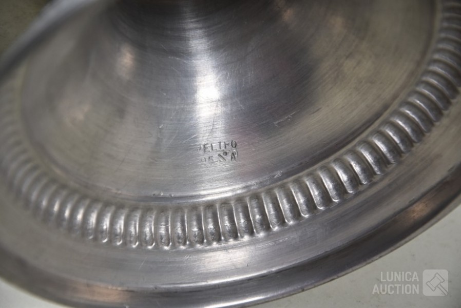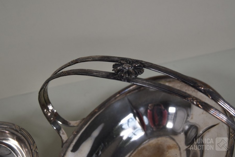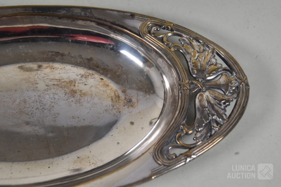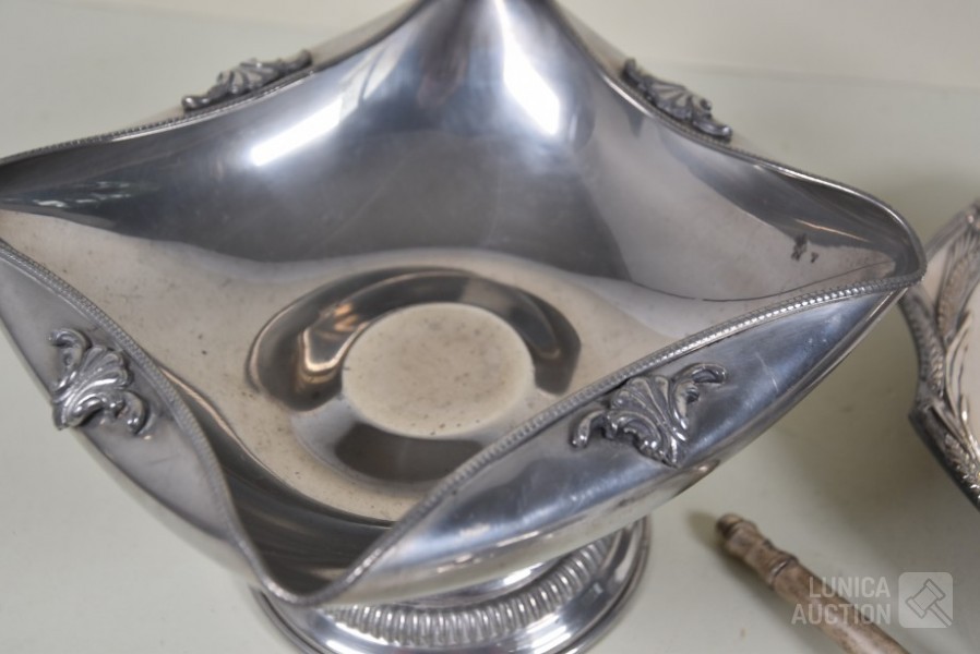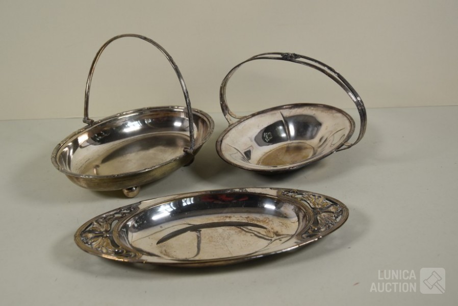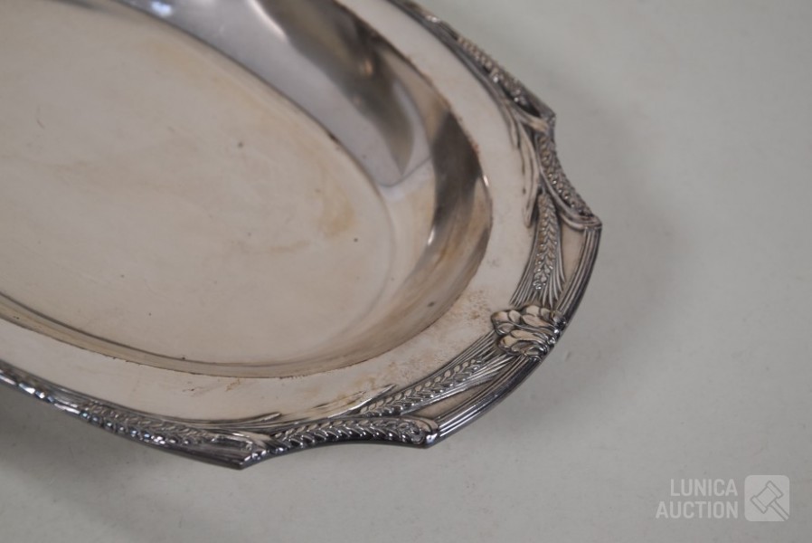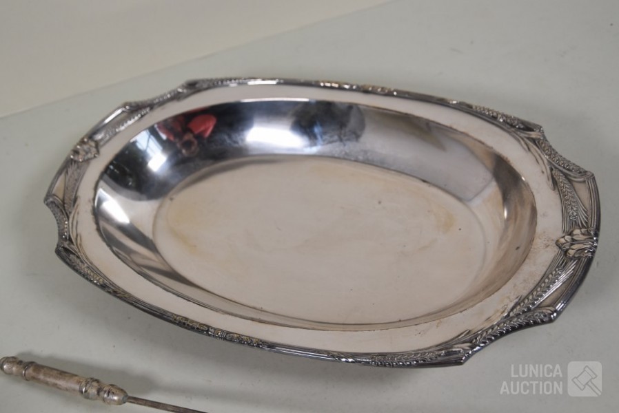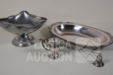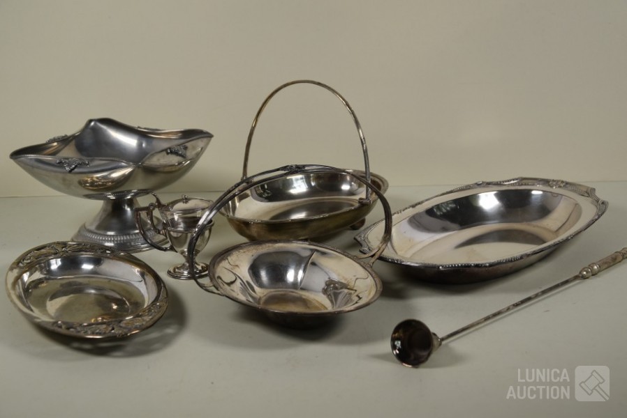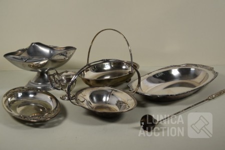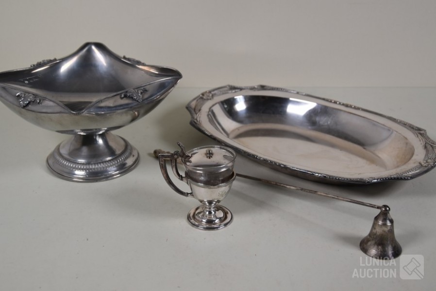 Diverse materialen o.a. verzilverd, peltro, Schwerter silber, epns enz. O.a. grote schaal 40x23 cm; kleine schaal 33x16 cm; 2x schaal met handvat, 25x20 cm; vlamdover, lengte 36 cm; Fruitschaal, 20x20x15 cm; enz. Mooie verzameling.