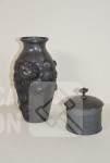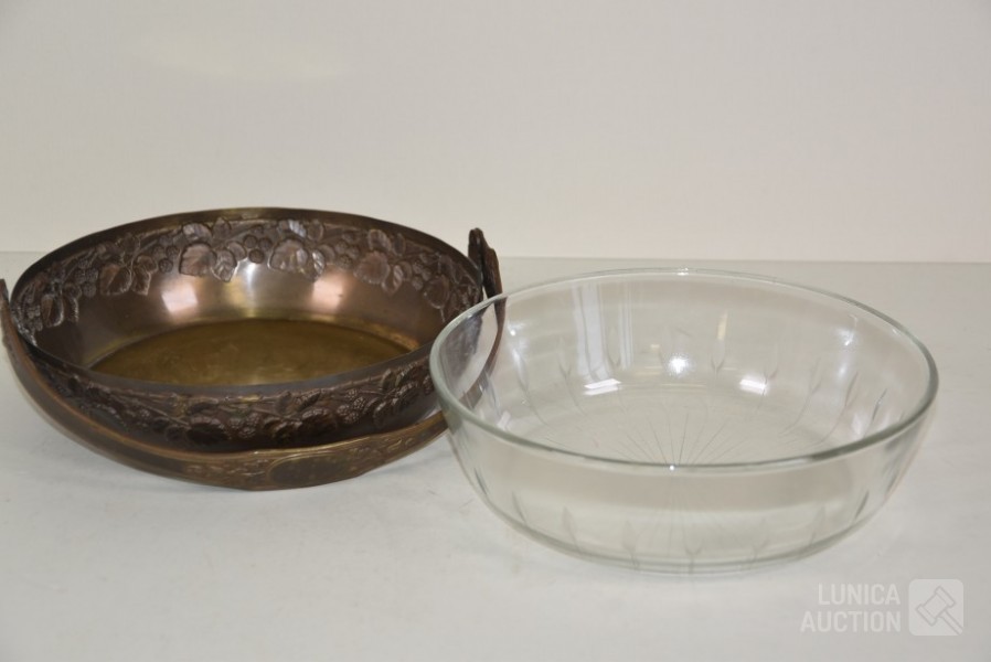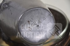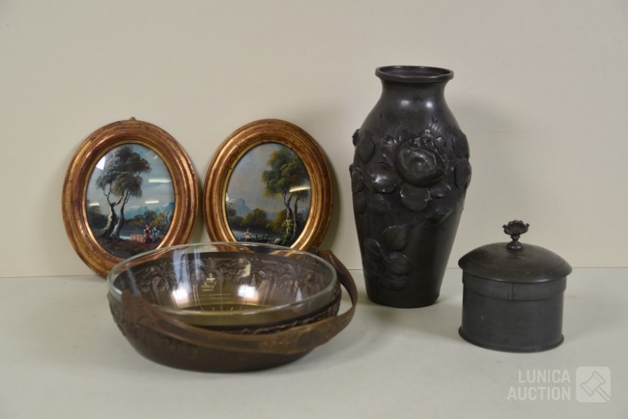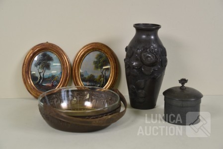 o.a. vaas, tin, hoogte 23 cm, gemerkt; miniatuur schilderijen, afmeting 13x16 cm; Messing schaal met handvat en glazen binnenschaal, doorsnede 20 cm; tinnen pot met deksel, hoogte 10 cm.