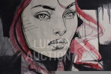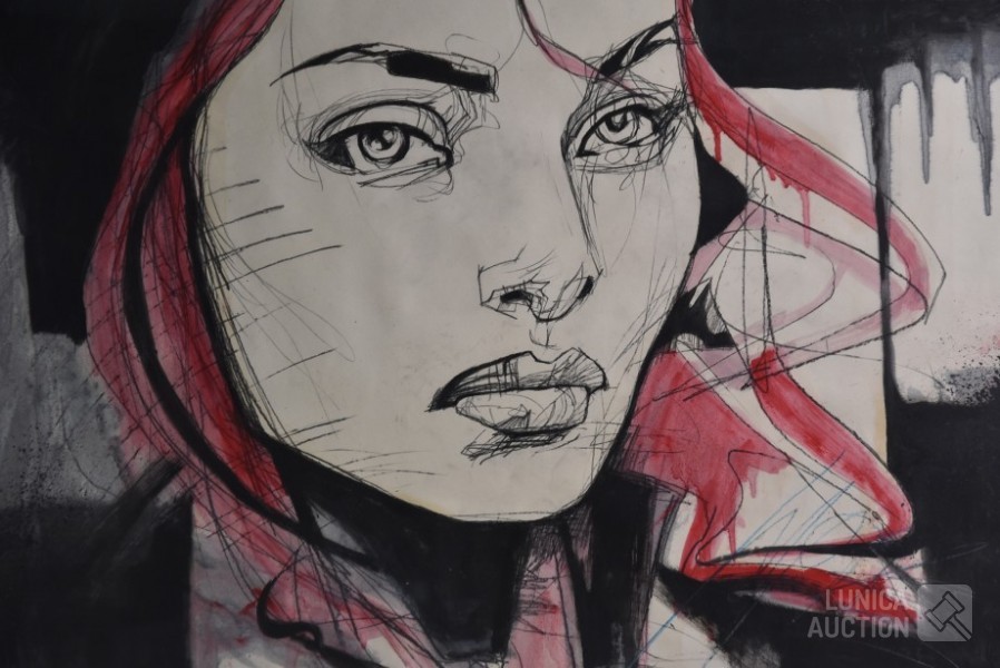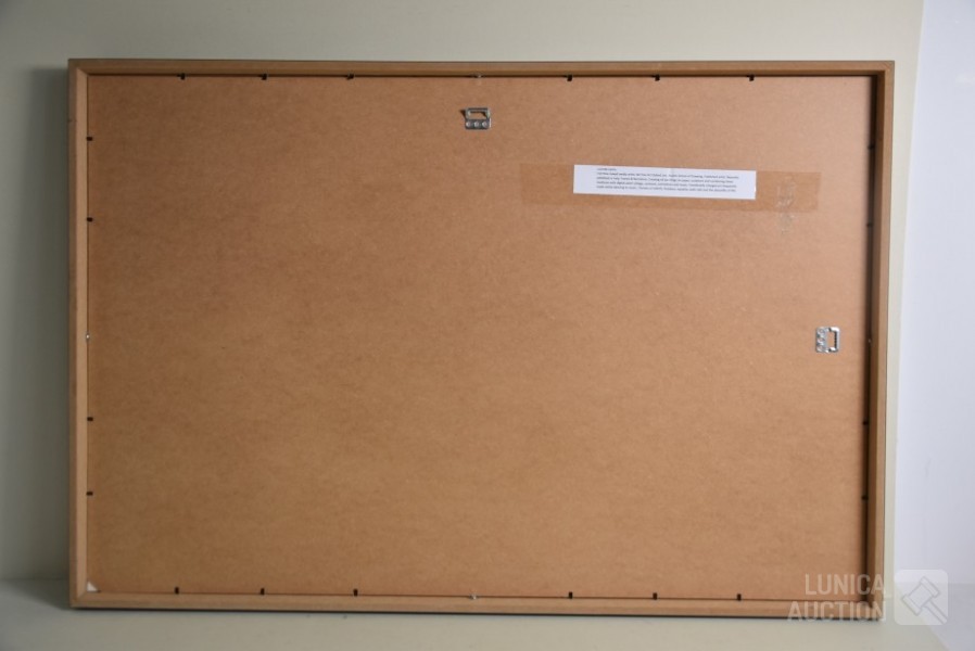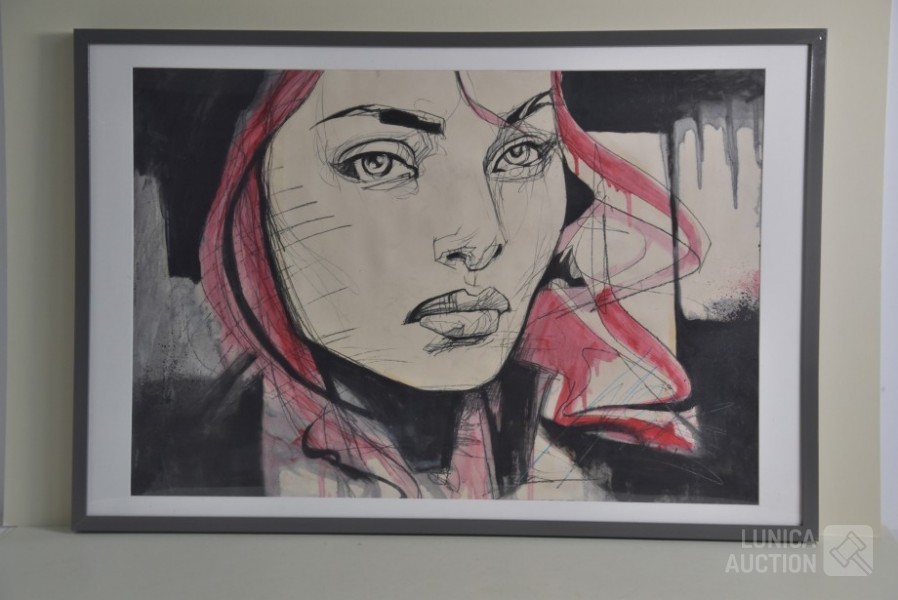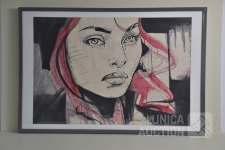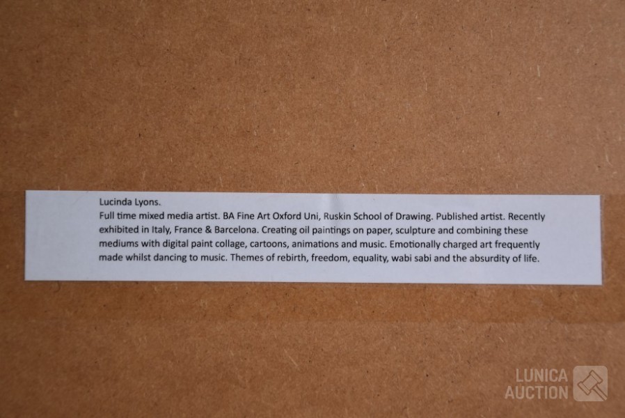 gemengde techniek op paier, ingelijst, achter plexiglas. Afmeting 95x65