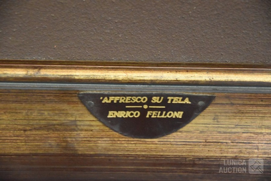 fresco techniek op doek, afkomstig van tentoonstelling Galleria Pomposiana Ferrara, 1976. Ingelijst, afmeting 88x118 cm!