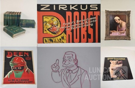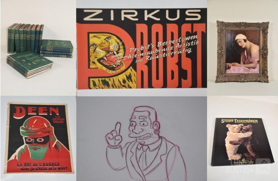 Bekijk de bijzondere veilingvoorwaardenIn deze online veiling bestaat het mooie aanbod, afkomstig van een privé verzameling, uit o.a. verzamelingen van vintage affiches vanaf ca. 1900 van kunst, circus, reclame, motorsport, treinen, toerisme enz o.a. ontwerpers RECKELBUS, ZOLNIERKIEWICZ, VERBAERE, FUNKEN, LENOBLE, LICHTENSTEIN, SAUDEK enz; Veel kunst van o.a. L. DERIJKS, J. KLUYTMANS, J. KAGIE, L. PENIN, G. EGGEN, J.HEYEN, S. KREUTZER, P. ZEGVELD, J. FRIEDLÄNDER, L. DE ROECK,K. MUIS, K. SHODO, J. BEZAAN, LJ HANSEN enz.; strips van o.a. Suske e Wiske, Kuifje, Kaptein Rob enz. Veel originele en zeldzame items van Tom Poes en O.Bommel, Marten Toonder; oude ansichtkaarten; oude boeken; Fotoboeken; Productietekening van SIMPSONS met certificaat; en veel meer.