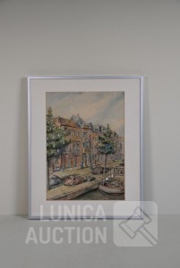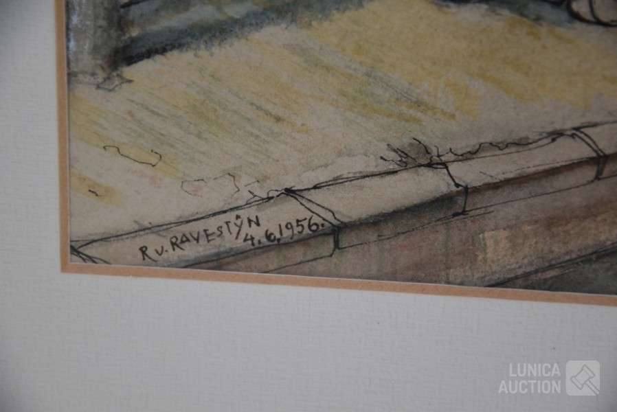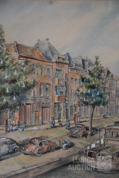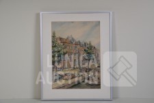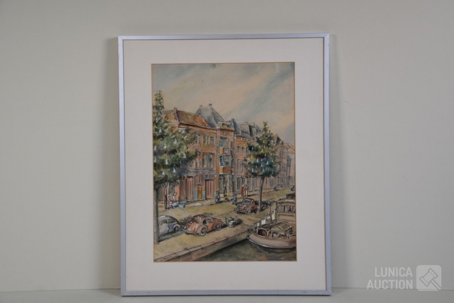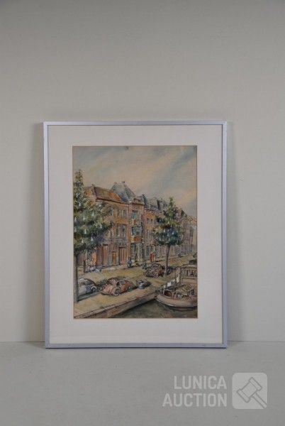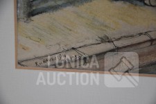 Techniek aquarel/inkt, Zeer gedetailleerd. Gesigneerd L.O.; Ingelijst, achter glas. Afmeting 40x50 cm.