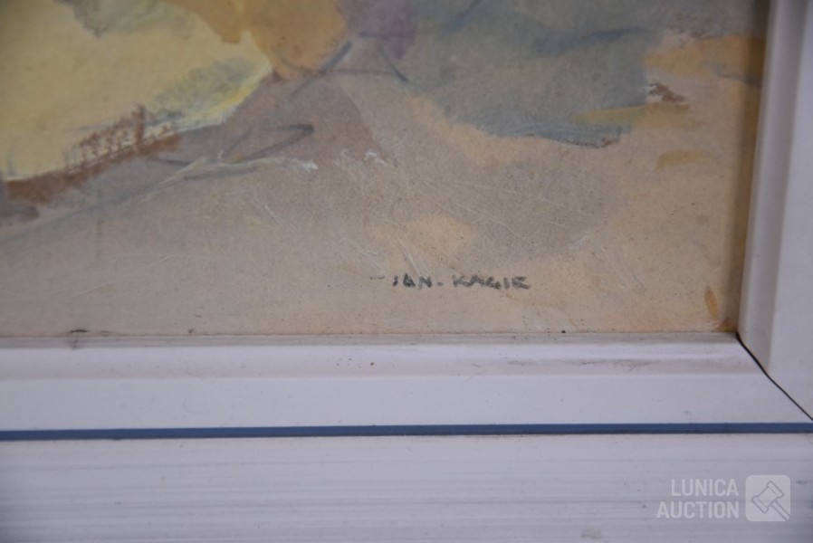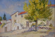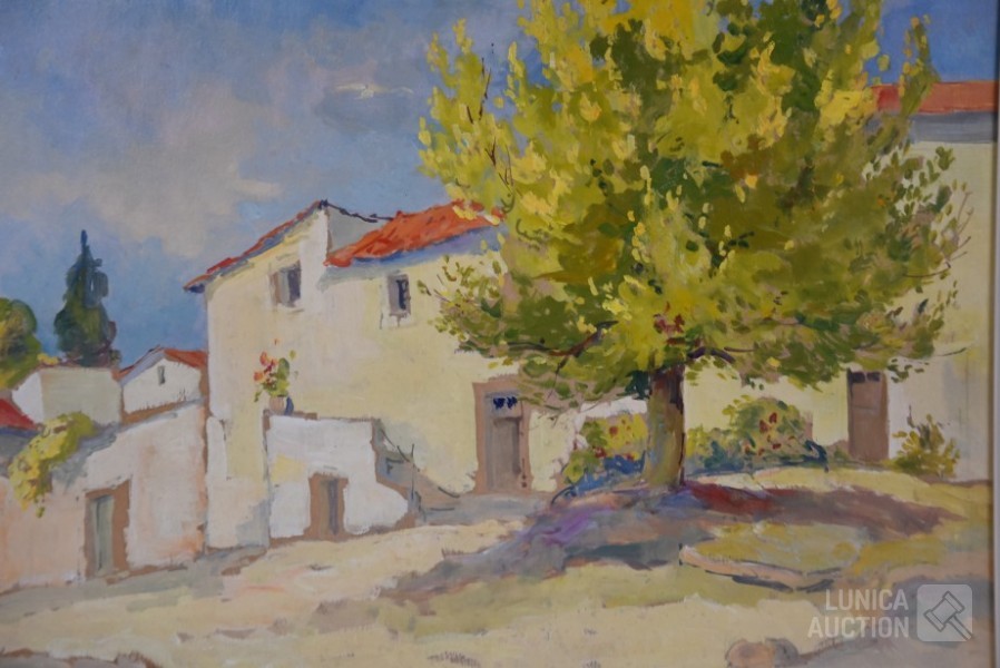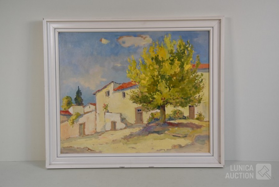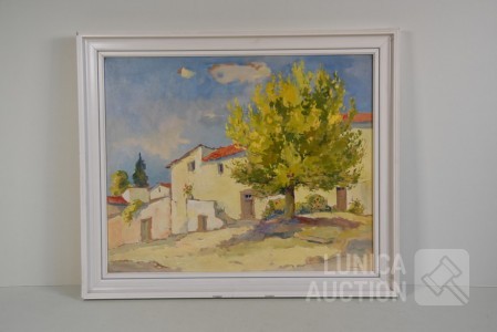 "huis in zuid-frankrijk", olieverf op schildersboard, gesigneerd R.O., ingelijst. Afmeting 65x55 cm.