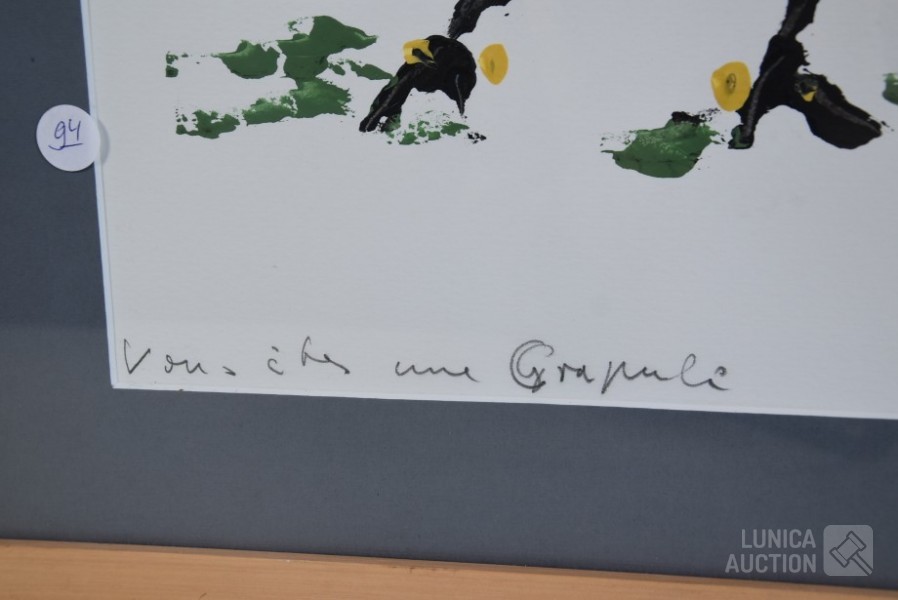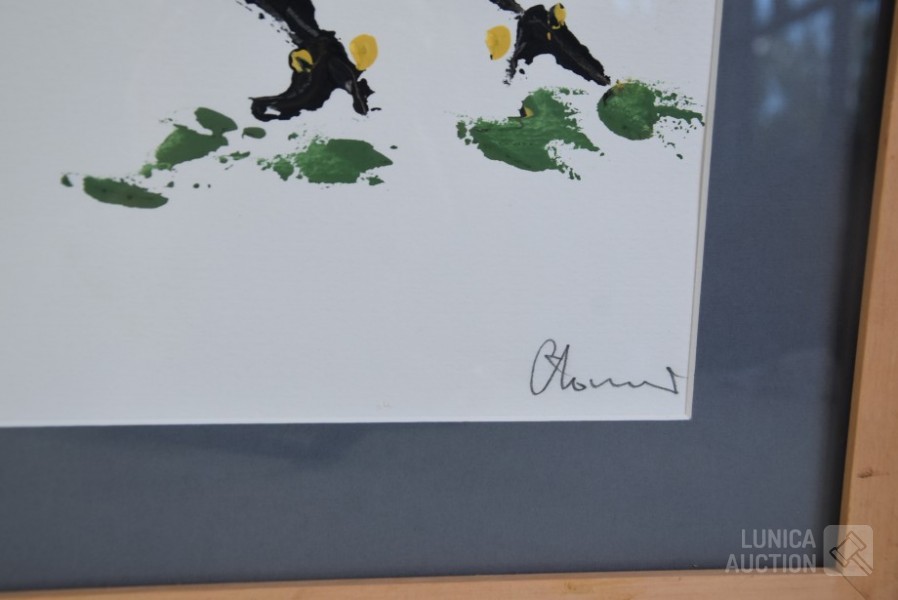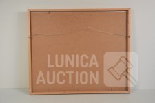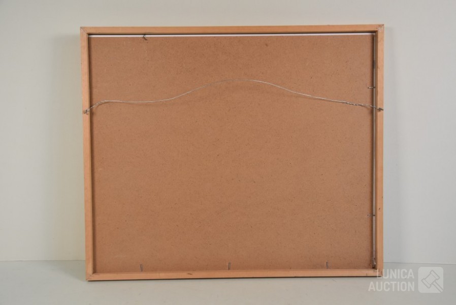 Acrylverf op papier, ingelijst achter glas. Afmeting 63x53 cm