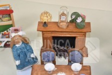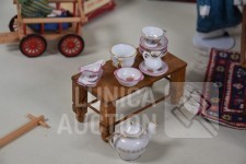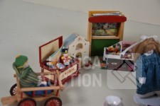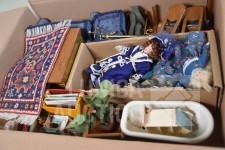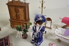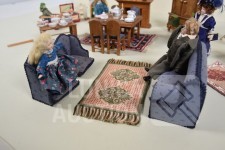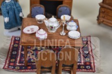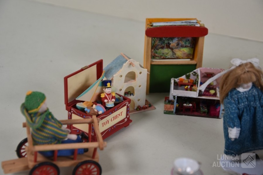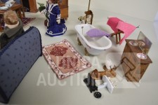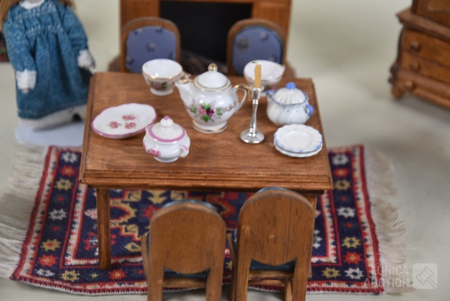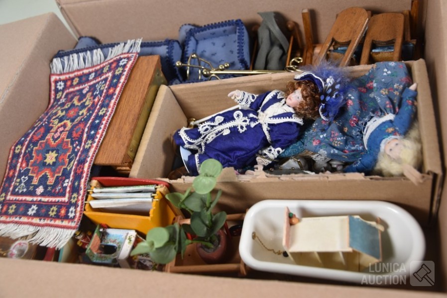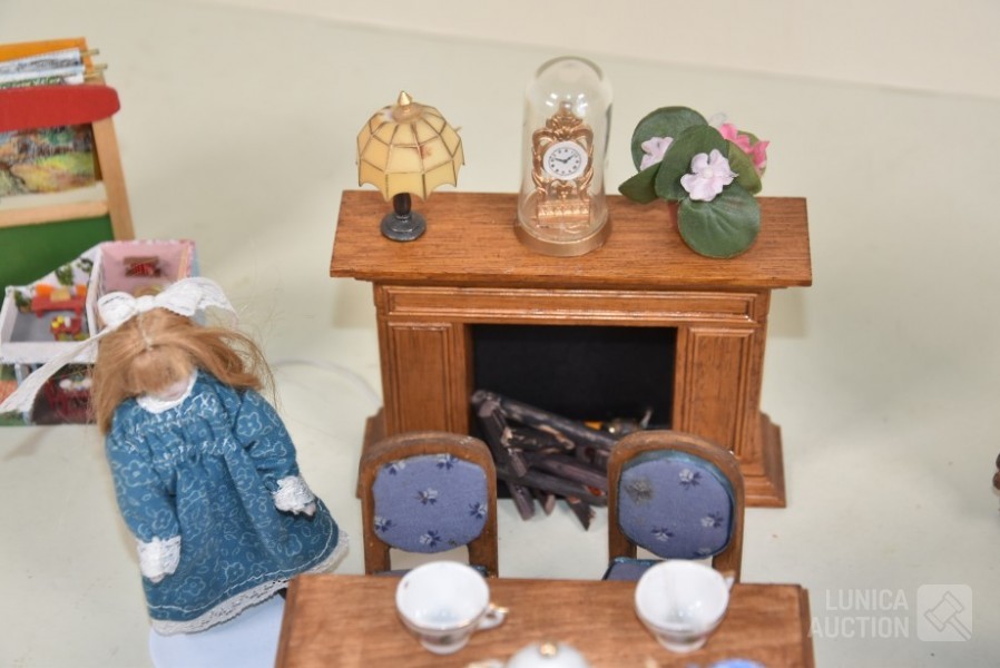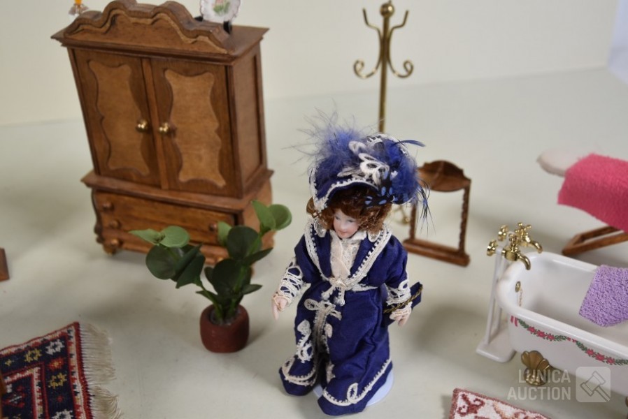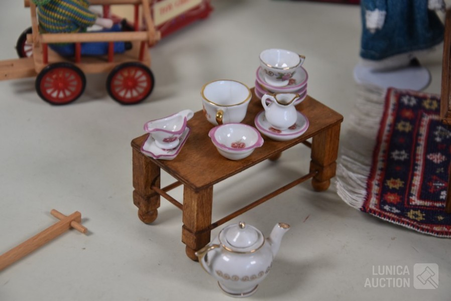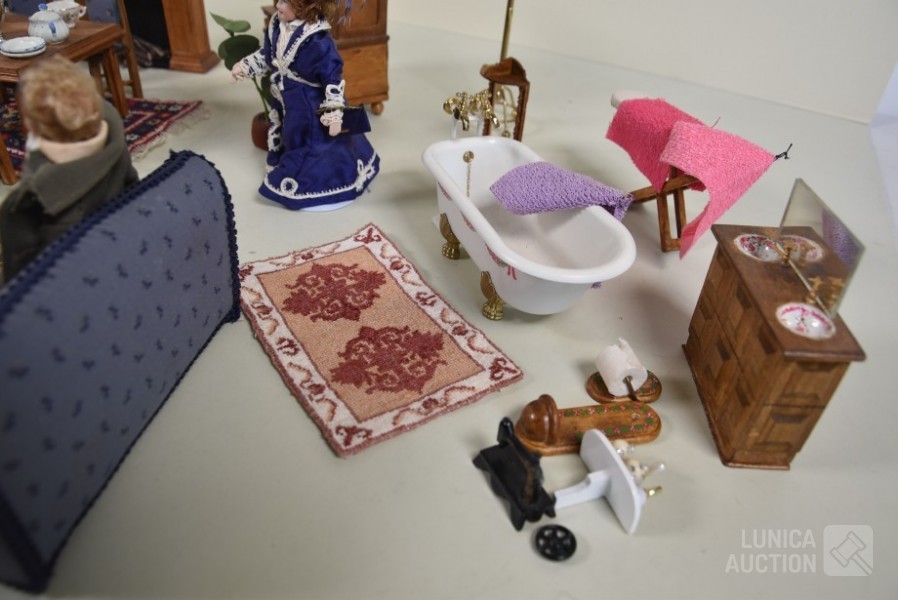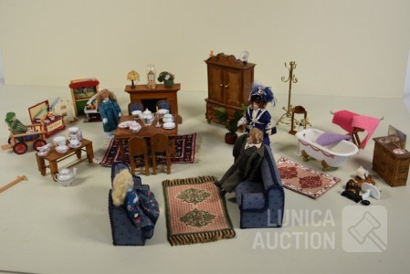 O.a. tafel en stoelen; bankstel; fauteuil; figuren, hoogte van 8 tot 15 cm; tapijten, afmeting 8x12 cm, 16x10 cm, 13x18 cm; kast; wastafel; strijkplank; servies, kapstok enz. Mooie verzameling.