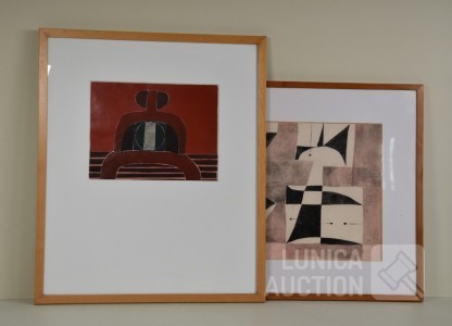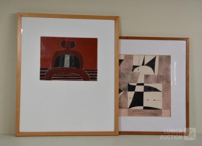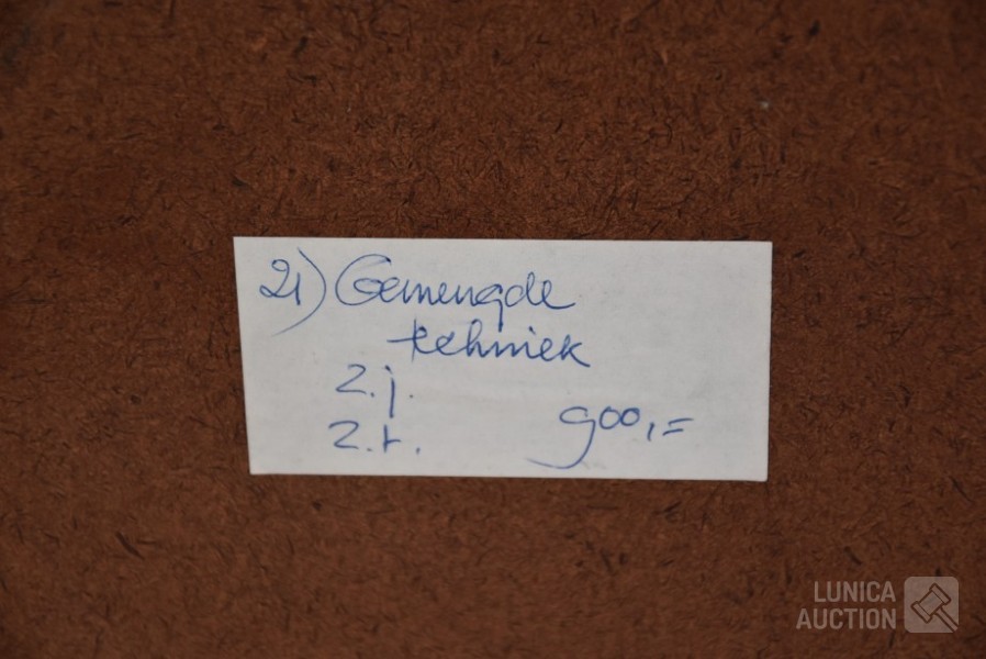 Niet gesigneerd. Gemengde techniek. Ingelijst, achter glas 67x50 en 53x63 cm.