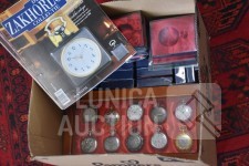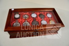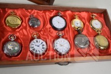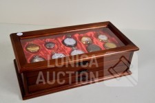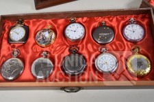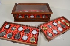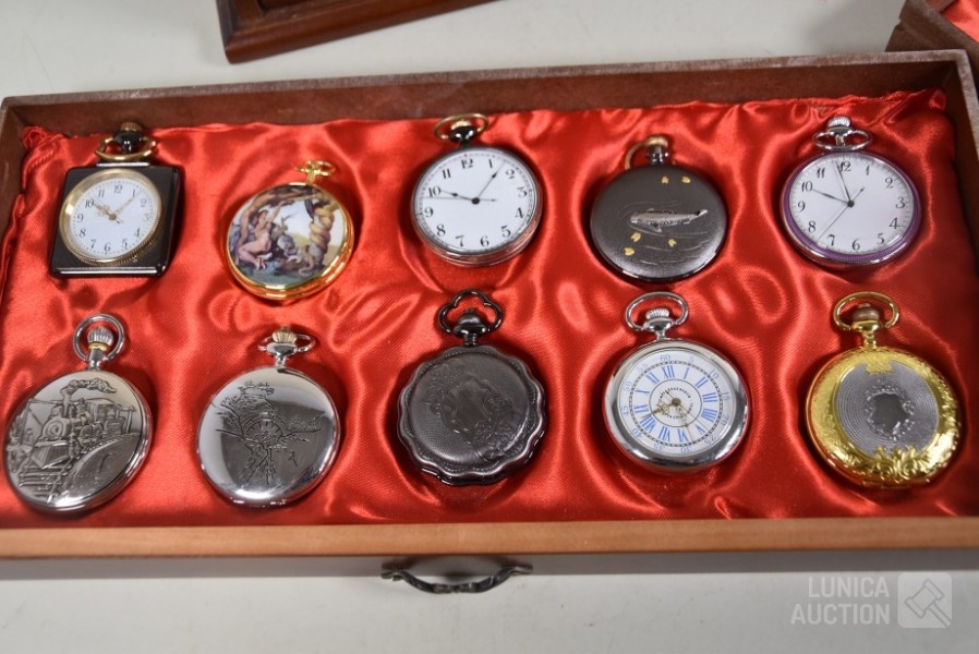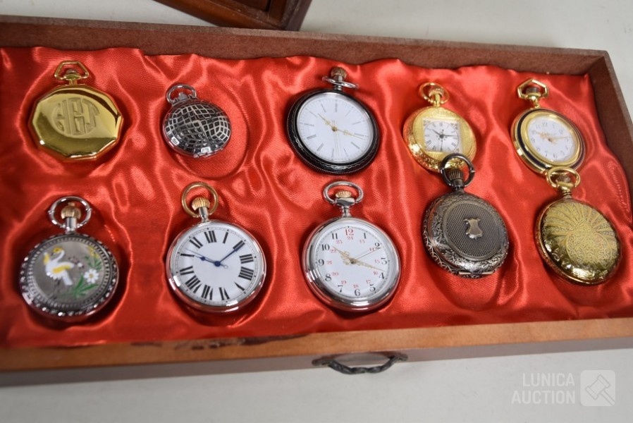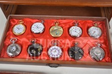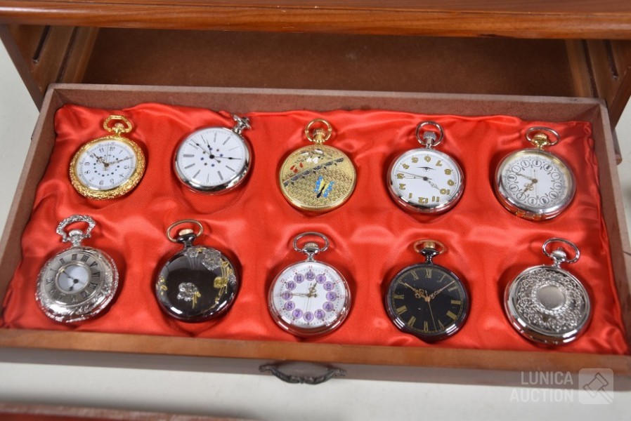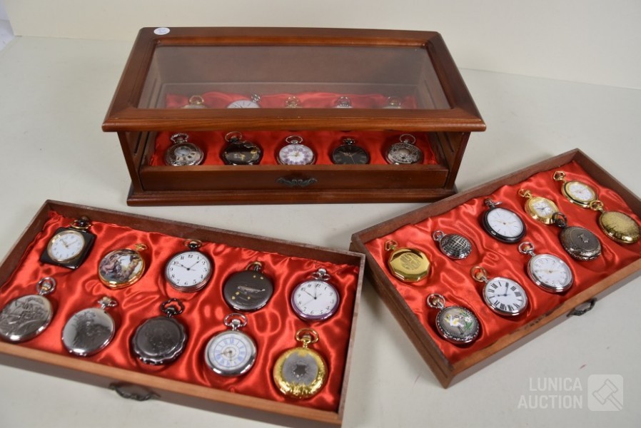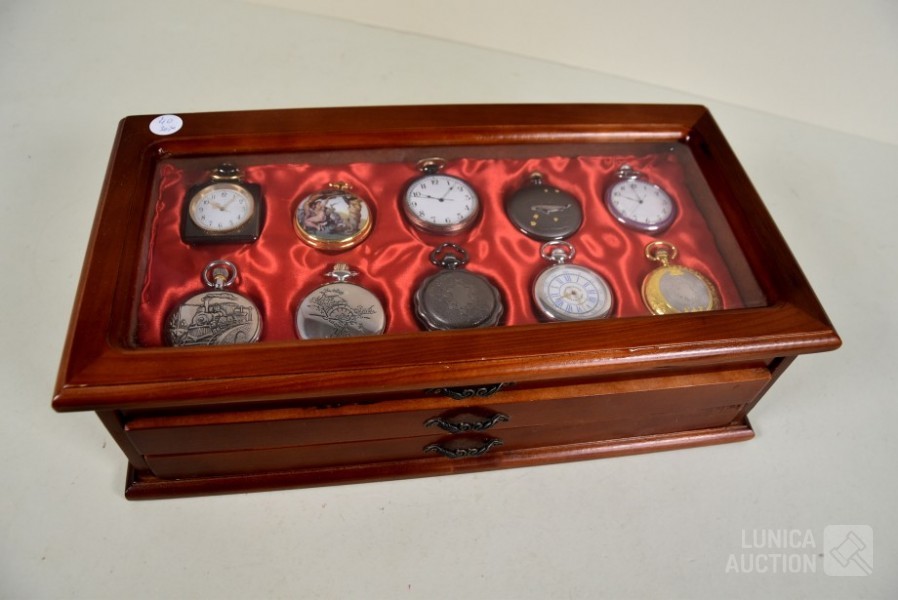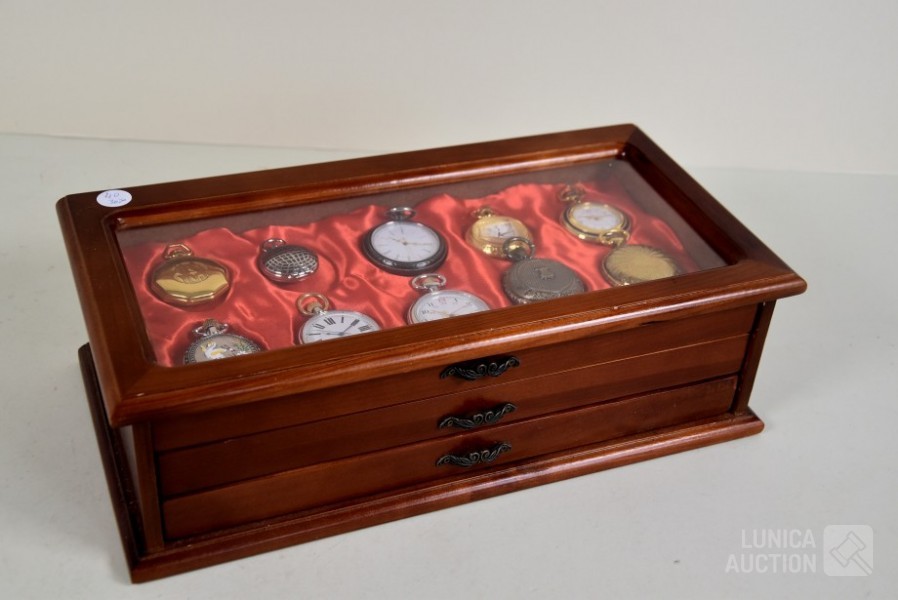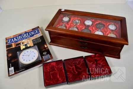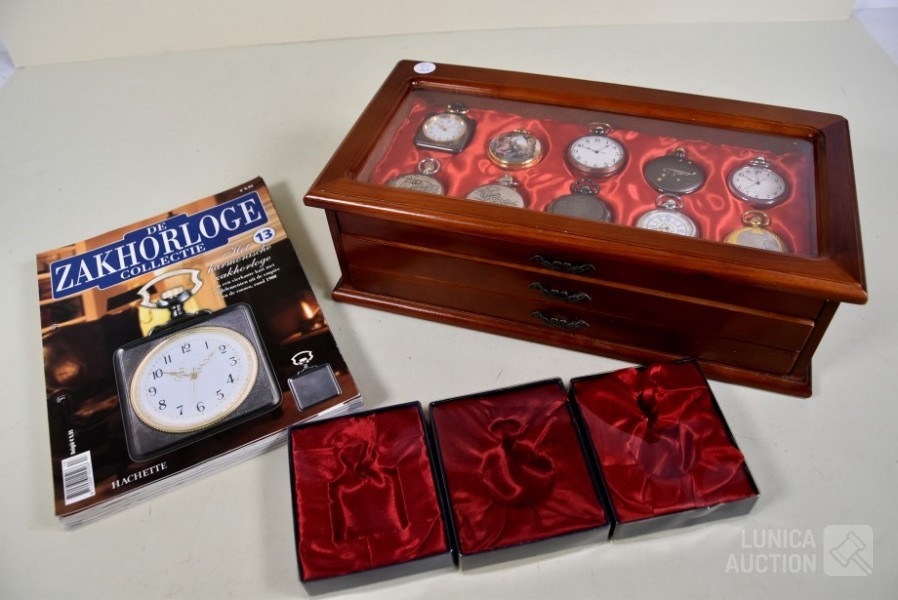 Inclusief vitrinekast en losse opbergdoosjes. Inclusief blad de "zakhorloge collectie" Werking zakhorloges onbekend.