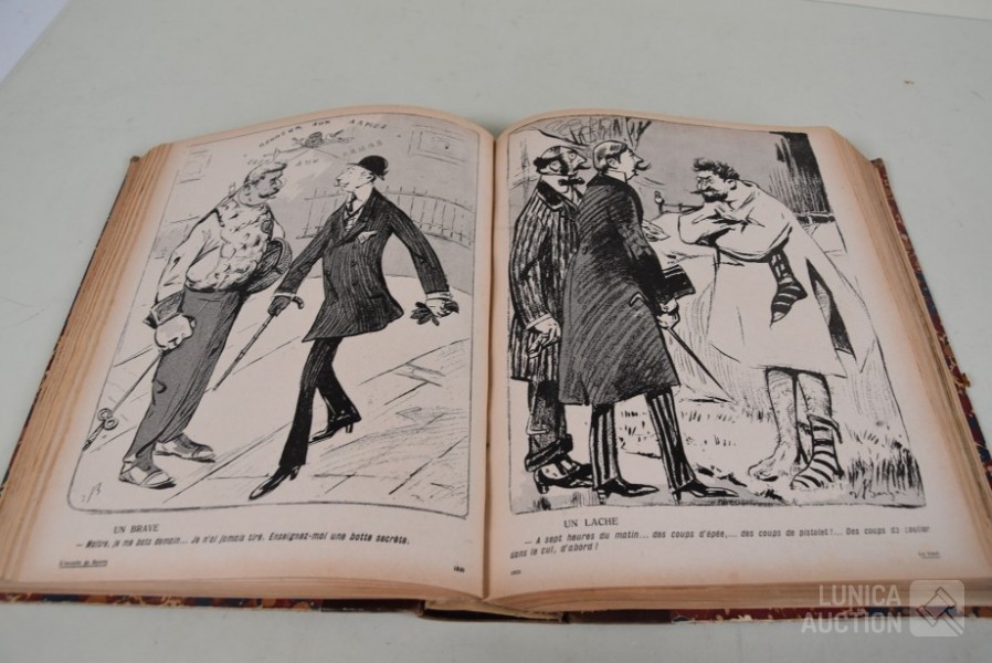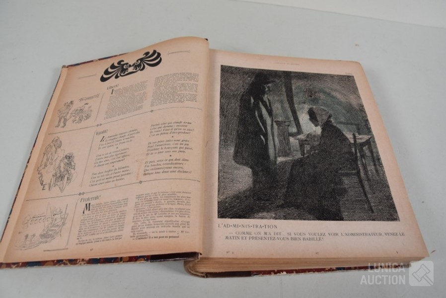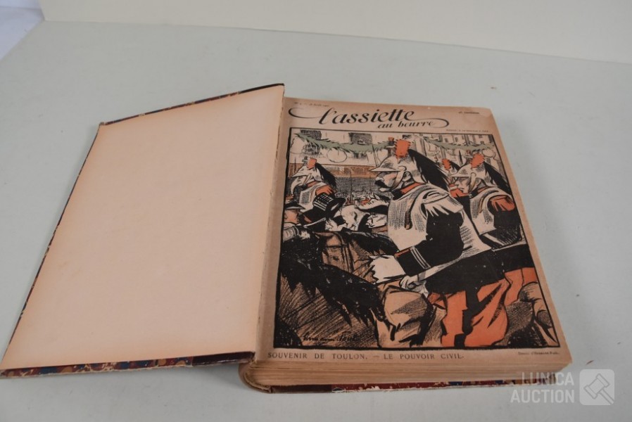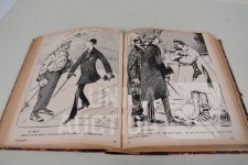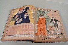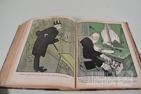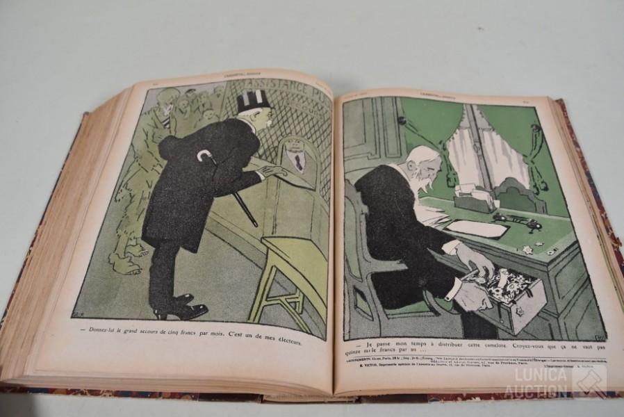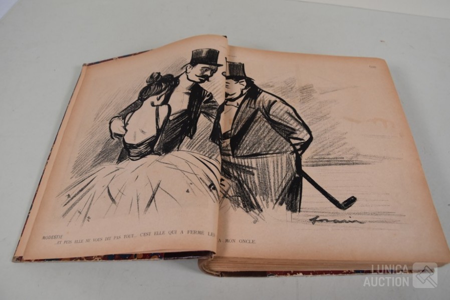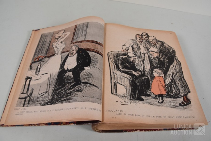 franstalig. Veel complete nummers (ca. 50 stuks) met spotprenten (kleur en zwart/wit) uit deze periode ingebonden in lederen omslag. Voor de echte verzamelaar. Afmeting 26x33 cm. Gezien de leeftijd in goede staat.