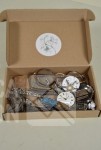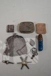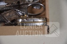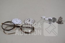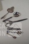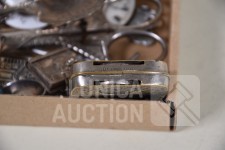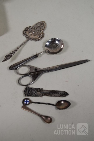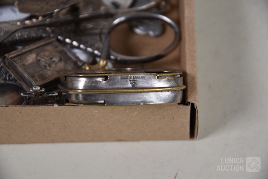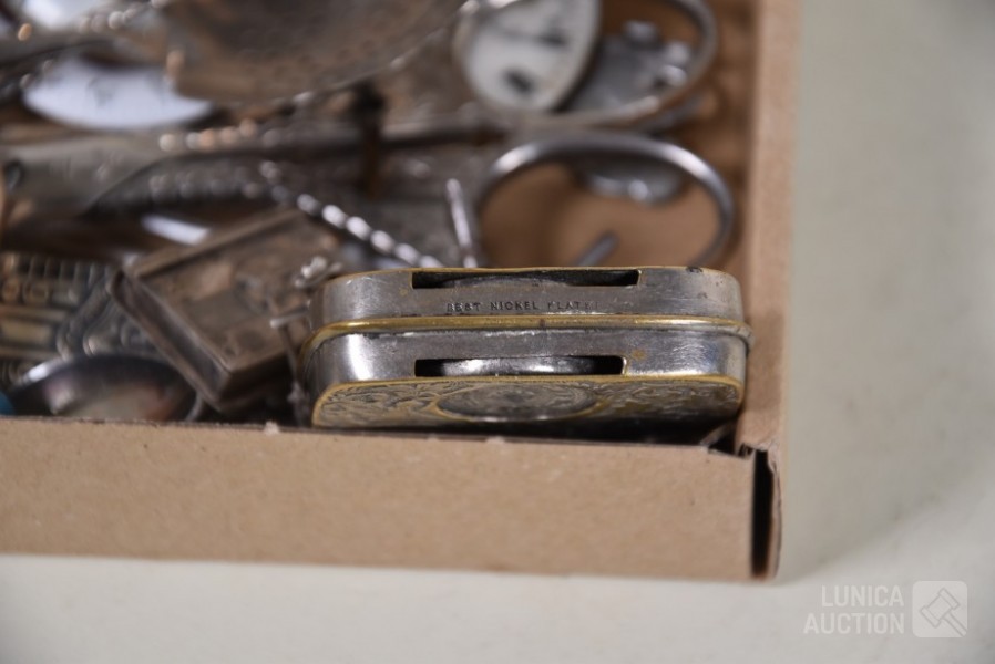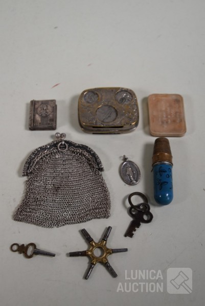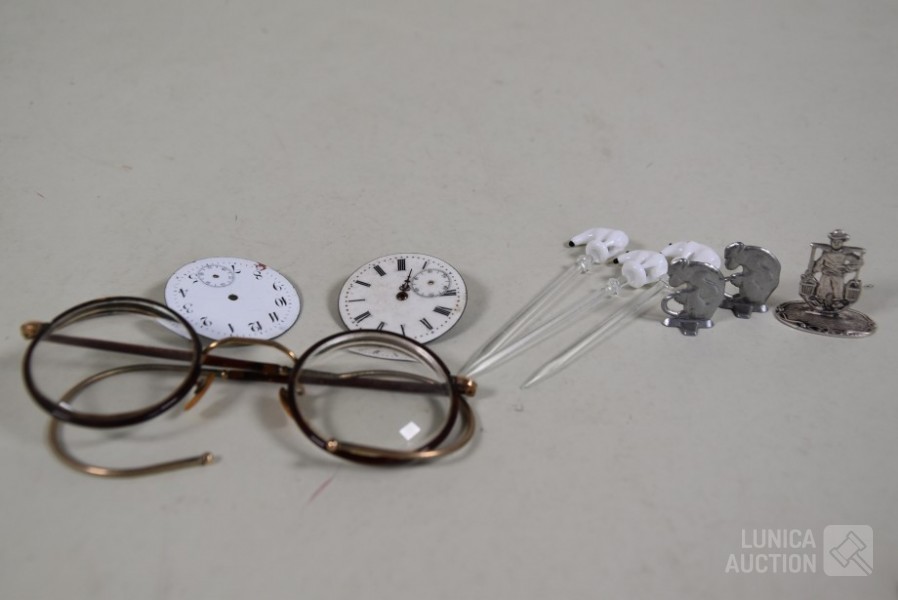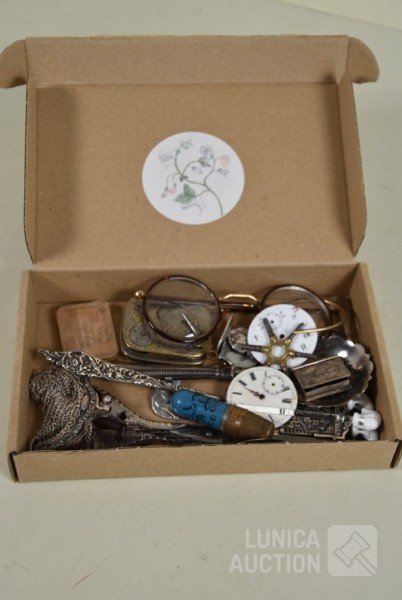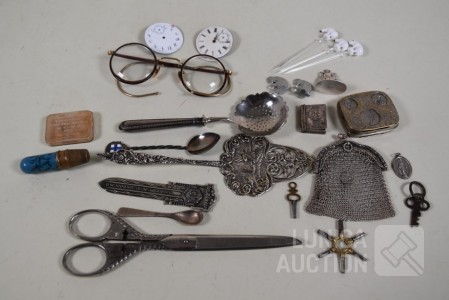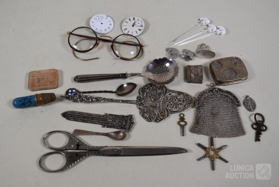O.a. vintage bril; verzilverd beugeltasje, afmeting 6x7 cm; zilveren strooilepel, gemerkt met zilvergehalte 800 en kroontje; Verzilverde Bladwijzer "Tot zoover" 1924-1934, GERO 90; zakhorloge sleutels; Wijzerplaten van zakhorloges; Naaigaren en vingerhoed; 3 prikkers met ijsberen; Miniaturen; Koffielepel van Marseille; Antiek Muntendoosje/portemonnee, JW BENSON, Engeland, nikkel plated; Verzilverde pasteischep/taartschep; Schaar van Weck&Stamm; enz. Mooie verzameling.
