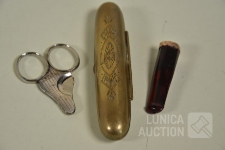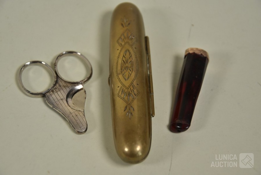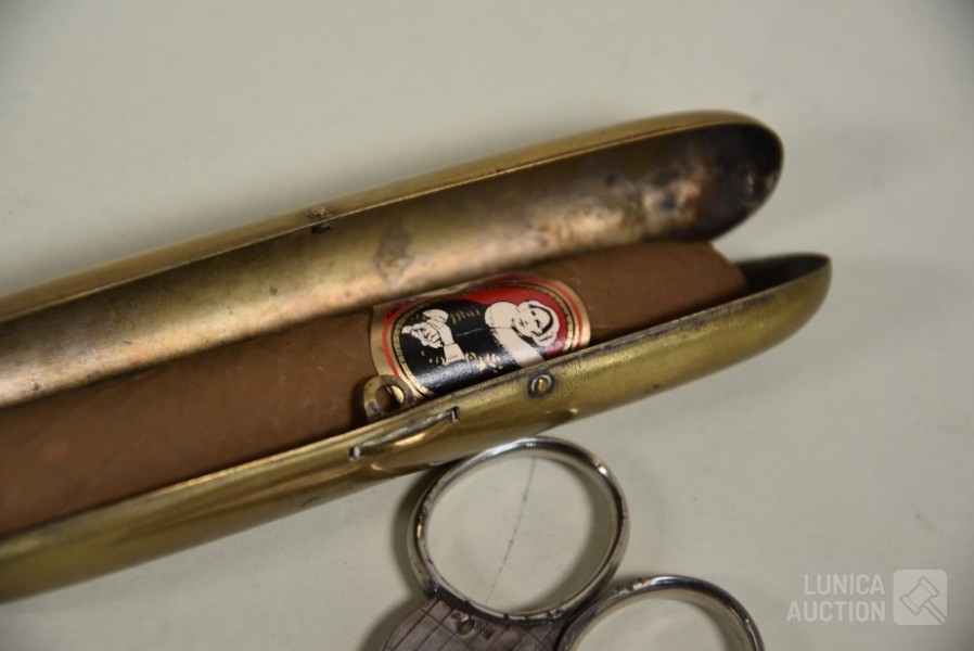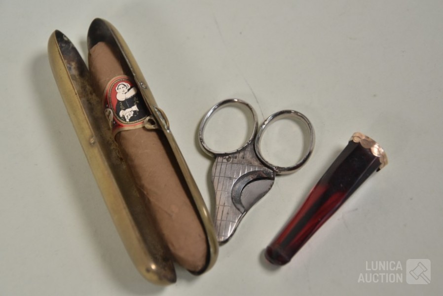 O.a. sigarenhouder met 14K gouden rand; Sigarenknipper, zilver 835, gemerkt; Sigarenhouder, koper met inhoud van 1 sigaar "Elisabeth bas"