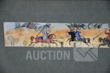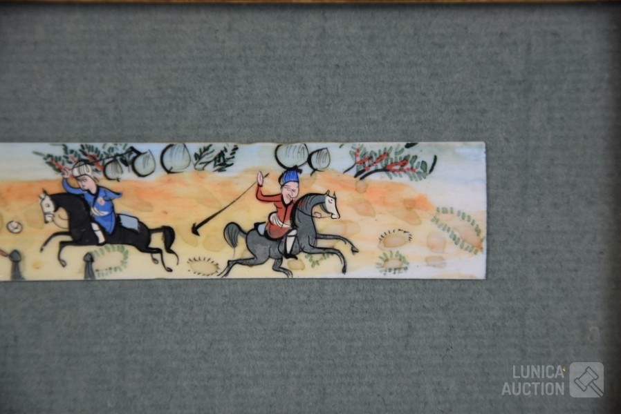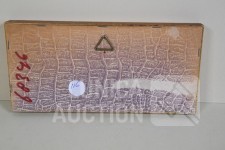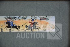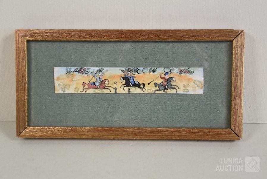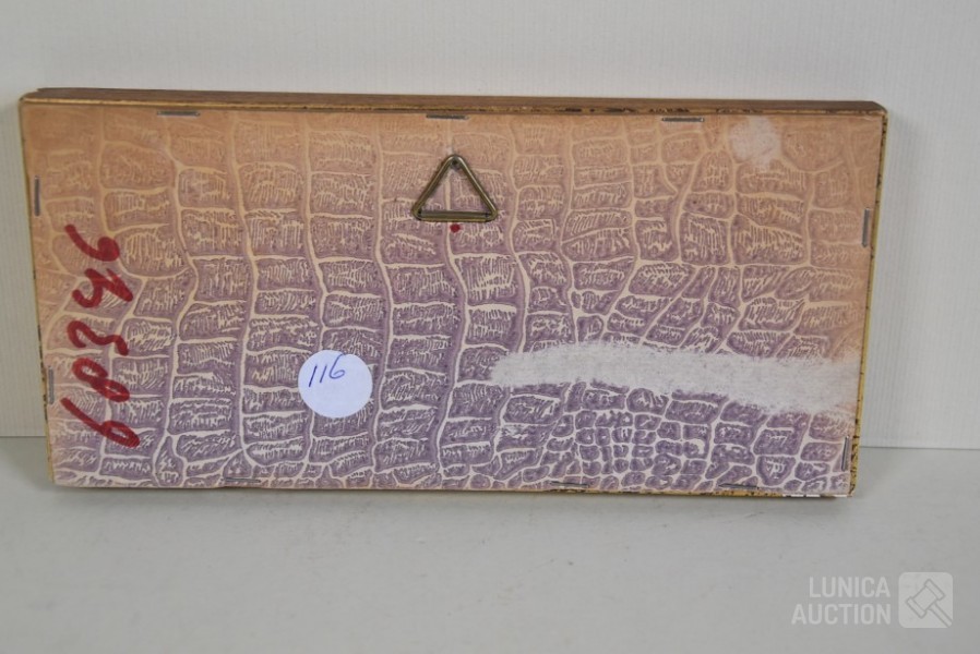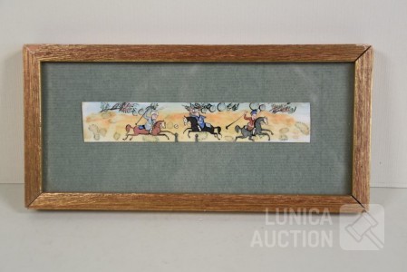 Ingelijst, achter glas. Afmetying 19x10 cm.