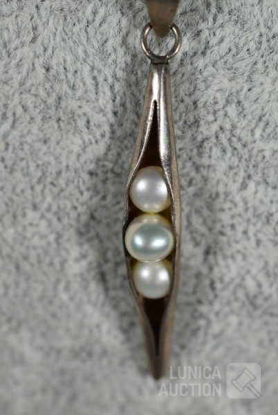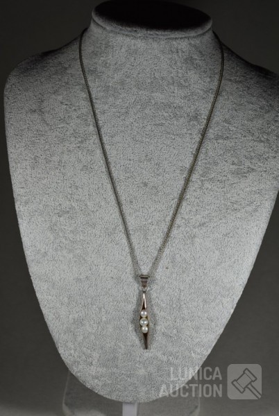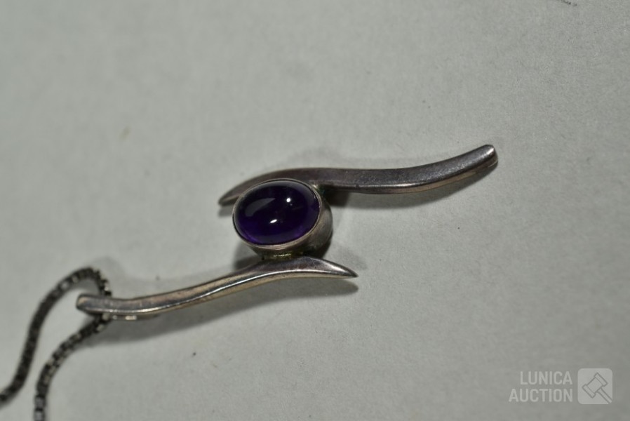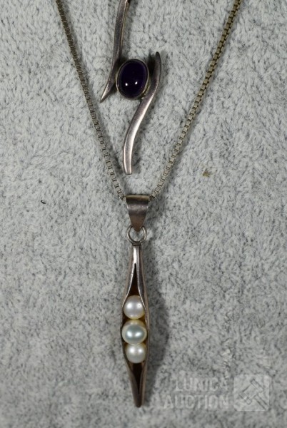 Halskettingen, gemerkt 925. lengte 40 cm en 48 cm; Hangers, niet gemerkt, laag gehalte zilver, met inzet van pareltjes en amethist Totaal gewicht 12,8 gram.