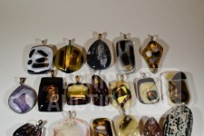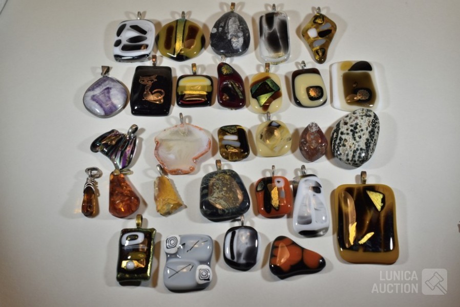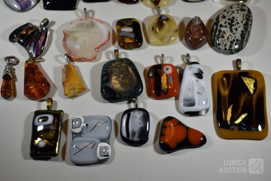 Gemaakt van diverse materiaal soorten zoals (meerkleurig) glas, natuursteen, mineraalsteen enz. Inclusief enkele losse stenen. Totaal gewicht ca. 500 gram. Diverse modellen. Afmeting variërend van 10x30 mm tot 40x60 mm.