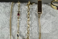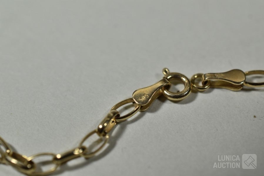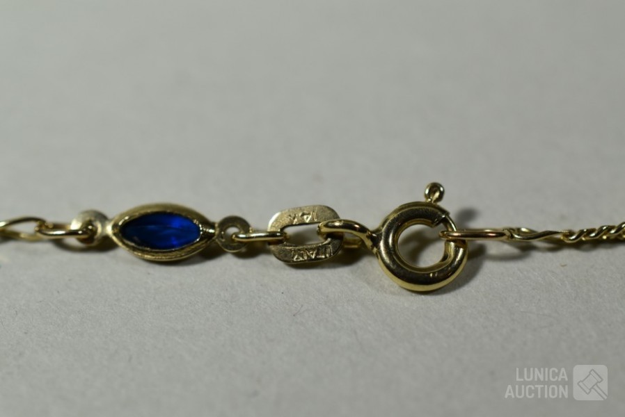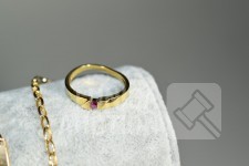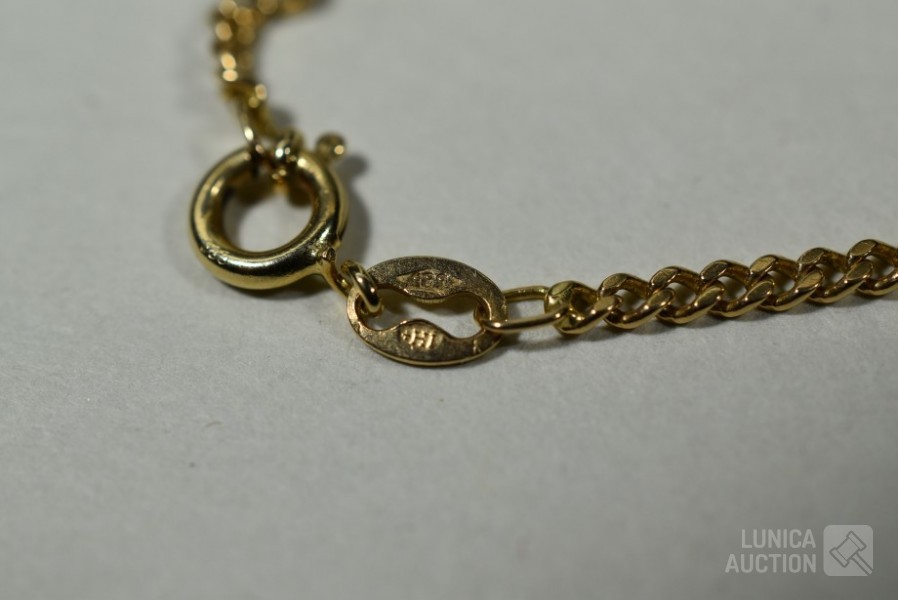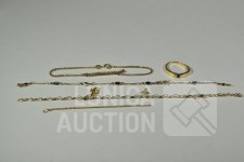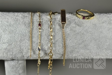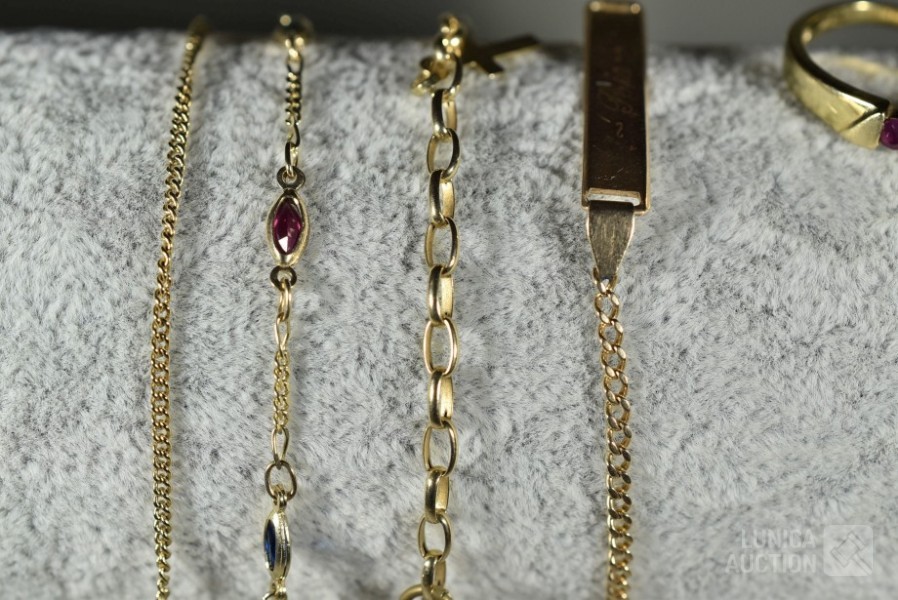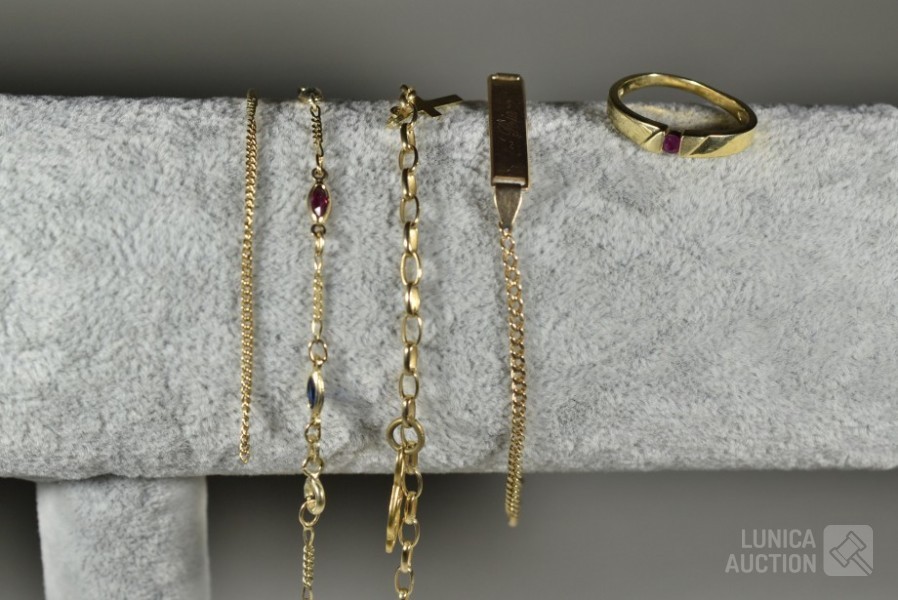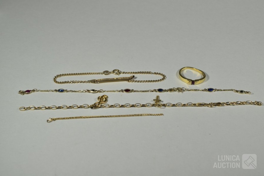 Diverse defecte armbanden en ring. Gemerkt met 585 of 14K. Totaal gewicht ca. 10 gram.