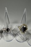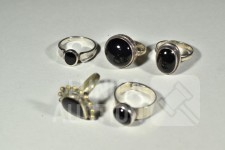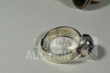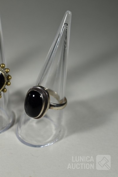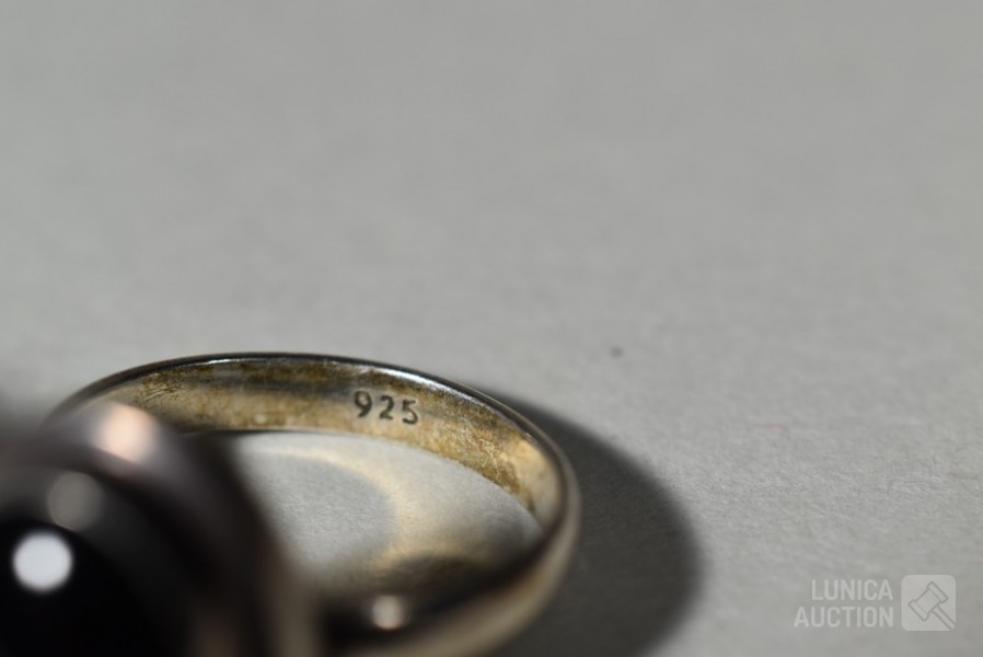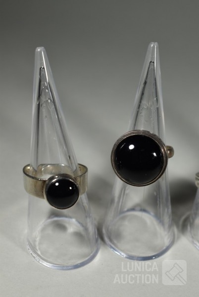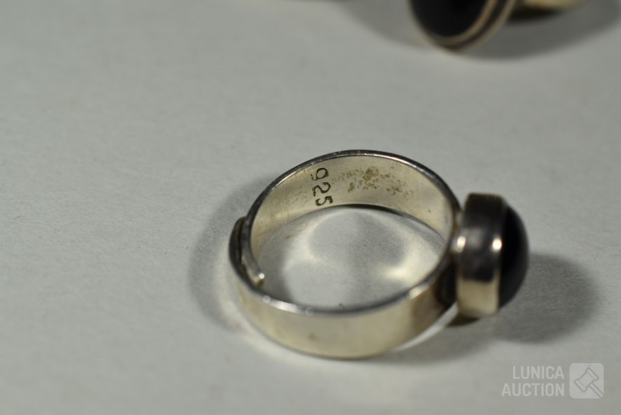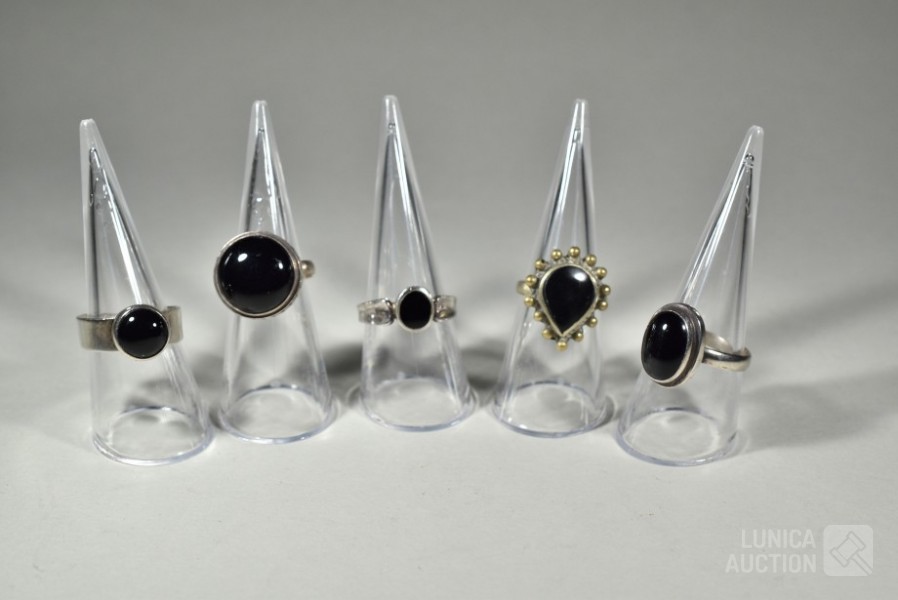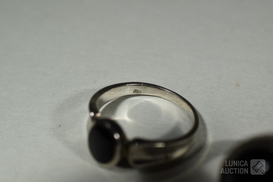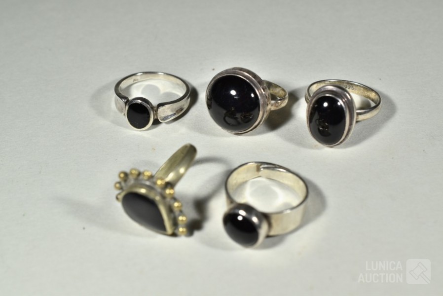 Gemerkt 4x 925, 1x niet gemerkt. met inzet van o.a. onyx. Ringmaat 17 mm, 18 mm, 18,5 mm en 19 mm. Totaal gewicht ca. 23 gram.