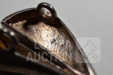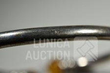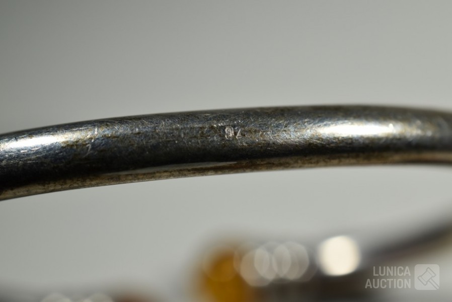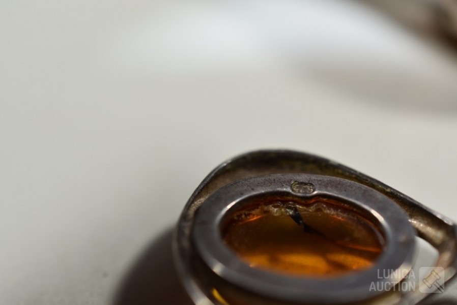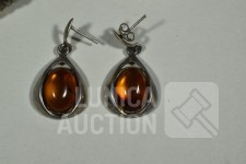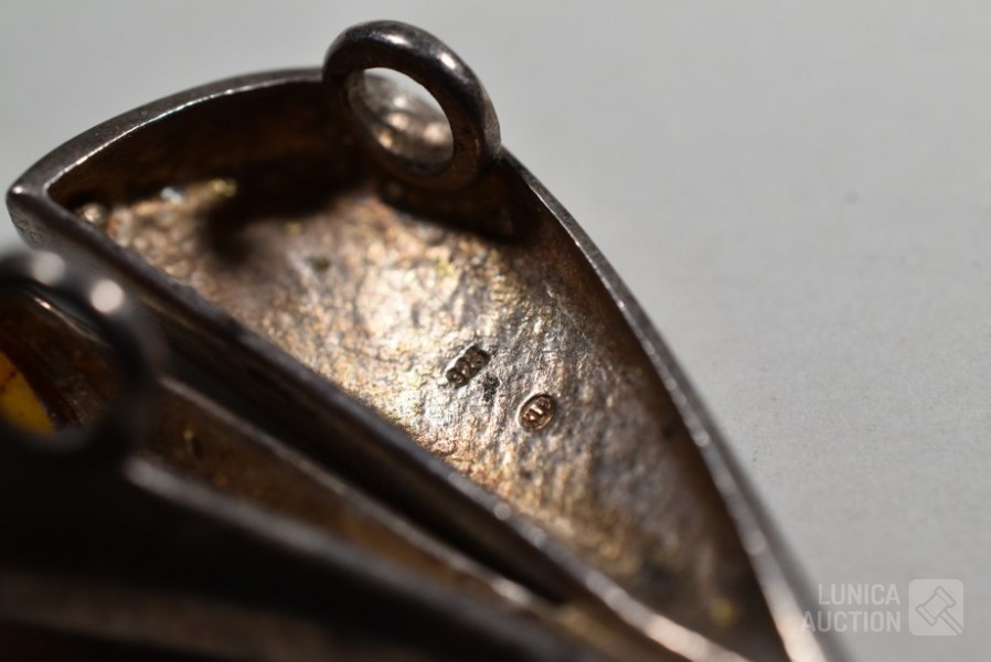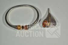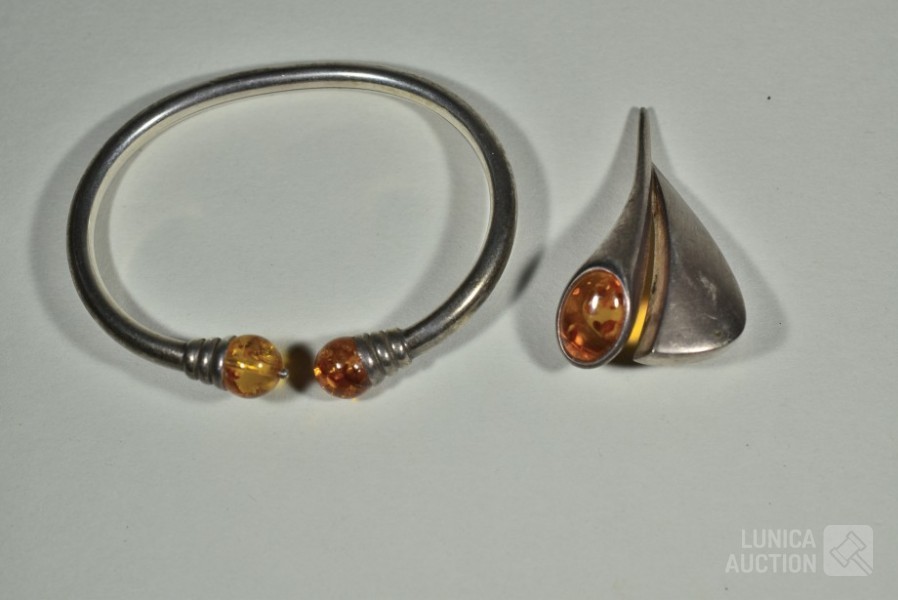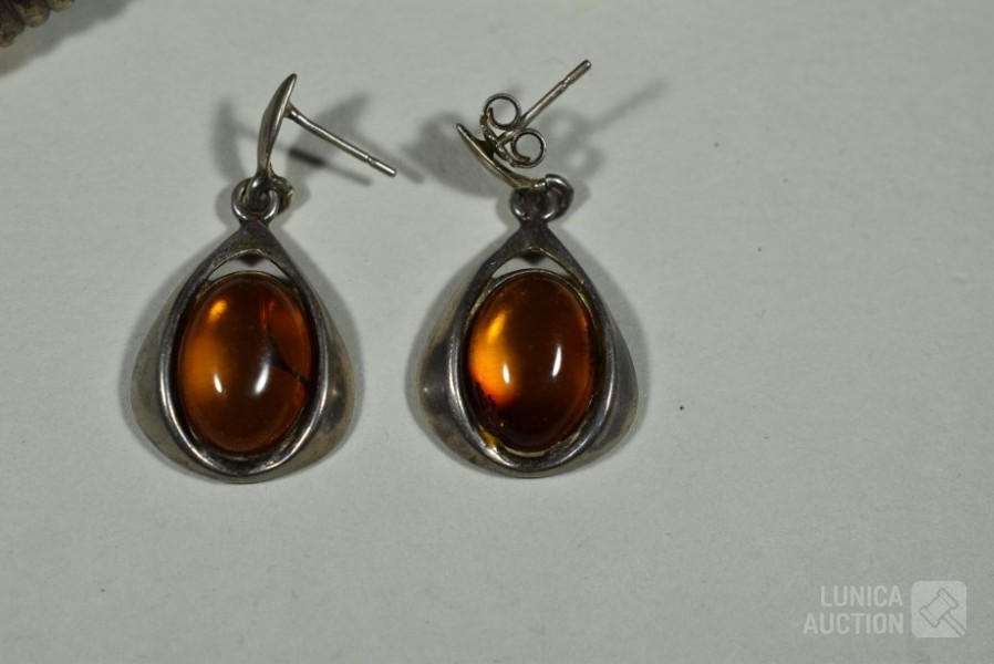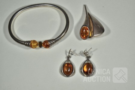 Met inzet van o.a. barnsteen. Oorstekers en hanger gemerkt 925. Armband niet gemerkt. Totaal gewicht ca.36 gram. Sluiting één oorsteker ontbreekt.