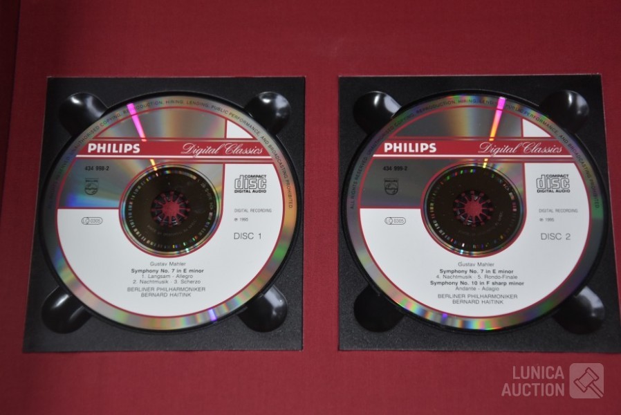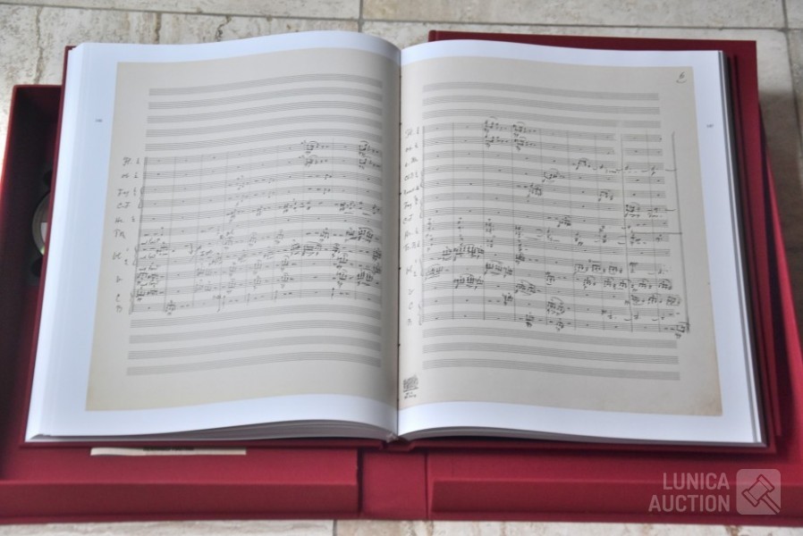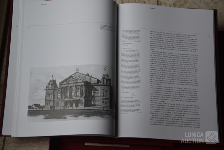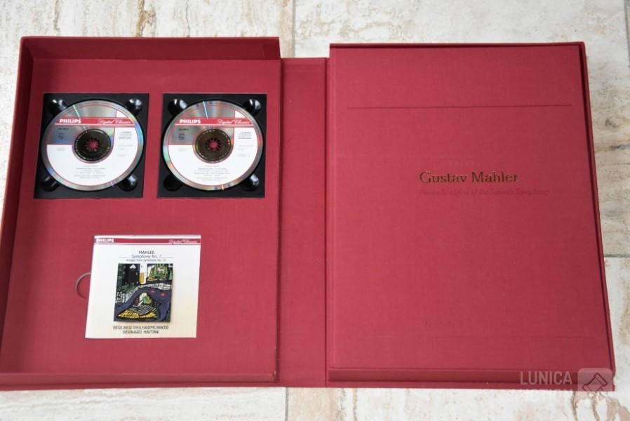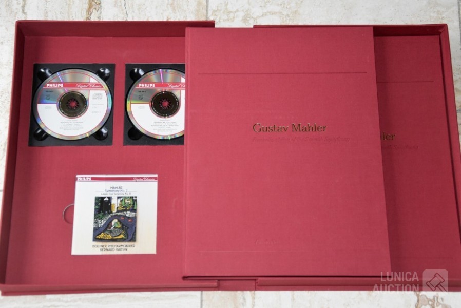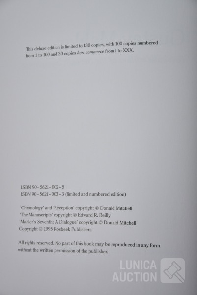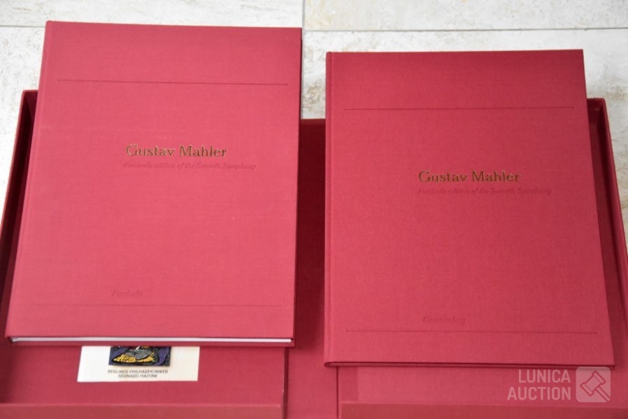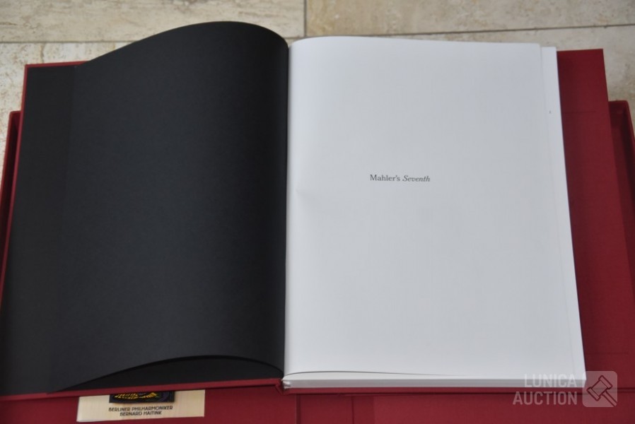 Het betreft hier de complete herdruk van de 7e symphonie van Mahler, 2 boeken in luxe cassette, gelimiteerde oplage, Engelstalig. Inclusief 2 Cd's van concert Berliner Philharmoniker met dirigent Bernard HAITINK. Titel: "Facsmile edition of the Seventh Symphony" Gustav Mahler; Uitgave: Rosbeek Publishers Amsterdam 1995. Met tekst van Donald Mitchell en Edward R. Reilly. Uitgave ter ere van Mahler Festival 1995, mogelijk gemaakt door Bernard Haitink fonds. Van deze luxe editie zijn er 130 gemaakt waarvan 100 genummerd met 1 tot 100 en 30 genummerd met romeinse cijfers I tot XXX. Deze cassette is nummer XXVIII (28) van XXX (30) Zeldzaam! Boeken en Cd's zijn in nieuwstaat. Luxe omslagcassette heeft enkele watervlekken. Afmeting omslag (bxdxh)41x6x30 cm. Gewicht ca. 6 kg