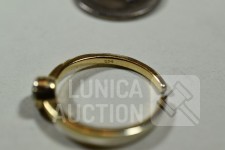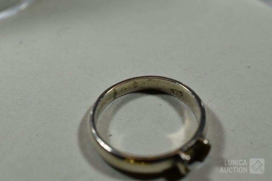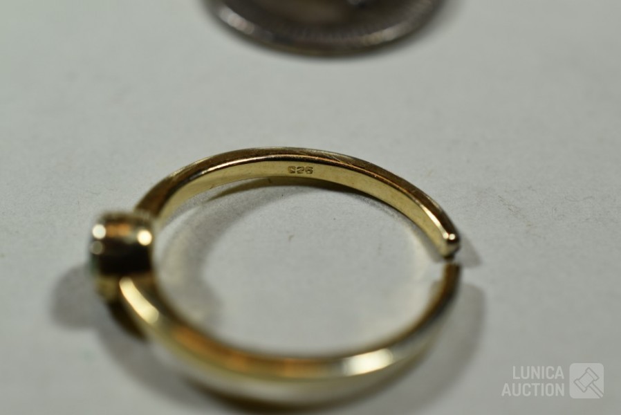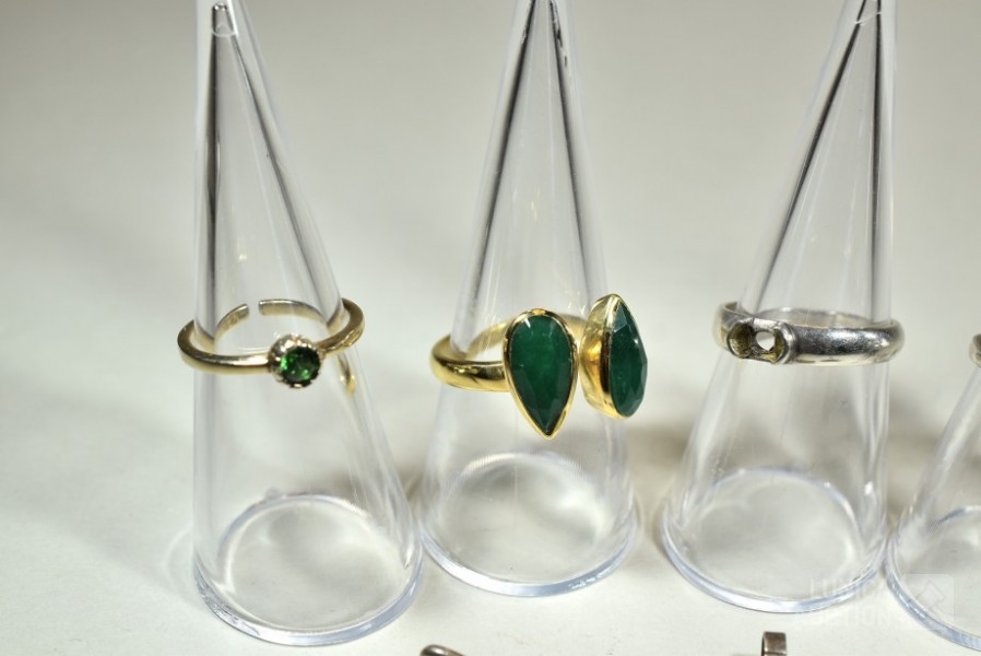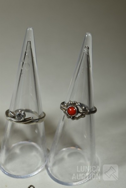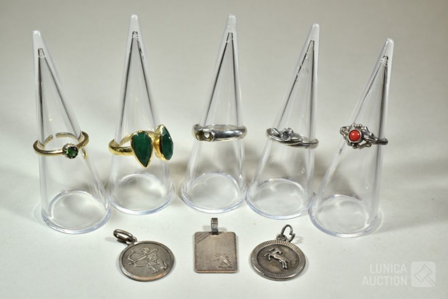 1x ring, zilver 835 met inzet van bloedkoraal, gewicht, 0,8 gram, ringmaat 15,5 mm; 2x ring gemerkt 925 in goudkleur, ringmaat 18,5 mm en 16 mm, gewicht ca. 5,3 gram met inzet van diverse stenen; 1 x ring gemerkt 925, zonder inzet van steen, gewicht 2,6 gram, ringmaat 18,5 mm; 1x ring, niet gemerkt met inzet van briljantje, gewicht 1,3 gram, ringmaat 17 mm; 3 hangers waarvan 1 gemerkt 835; Één hanger is geen zilver.