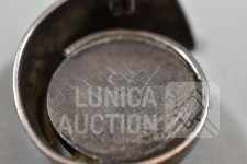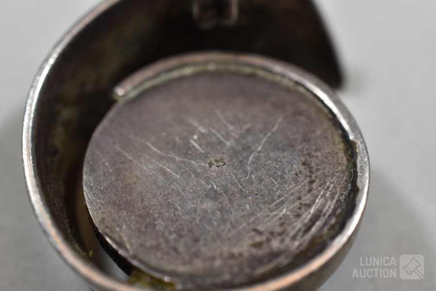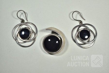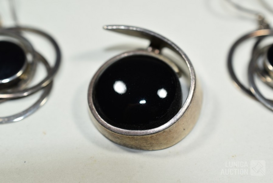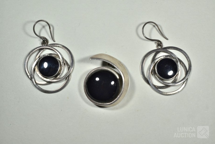 Hanger gemerkt met 925; Oorhangers niet gemerkt. Totaal gewicht ca. 24 gram. Doorsnede hanger ca. 28 mm, oorhanger ca. 30 mm.