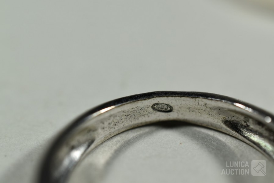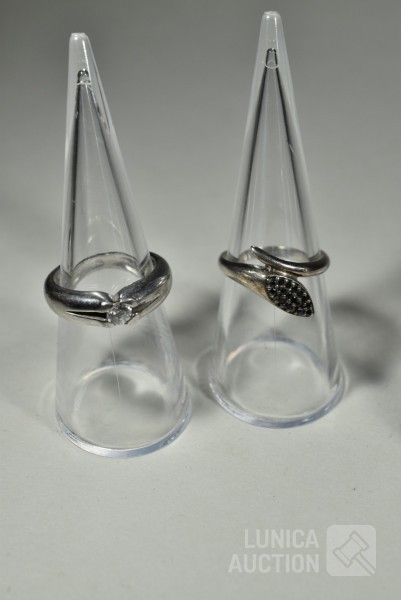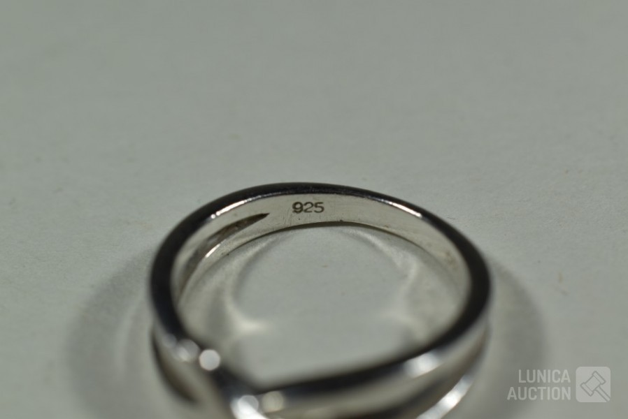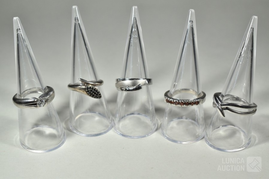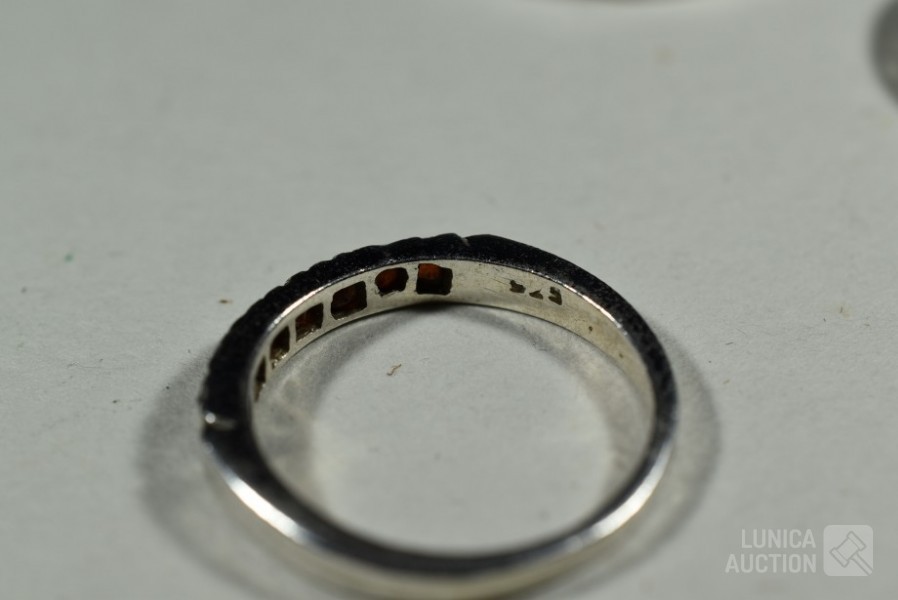 Gemerkt 4x 925, 1x niet gemerkt; Ringmaat 17 mm, 18 mm; Totaal gewicht ca. 17,5 gram. Met inzet van diverse edelsteentjes en één briljantje.