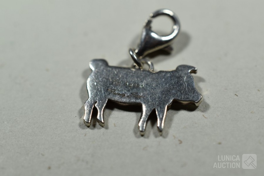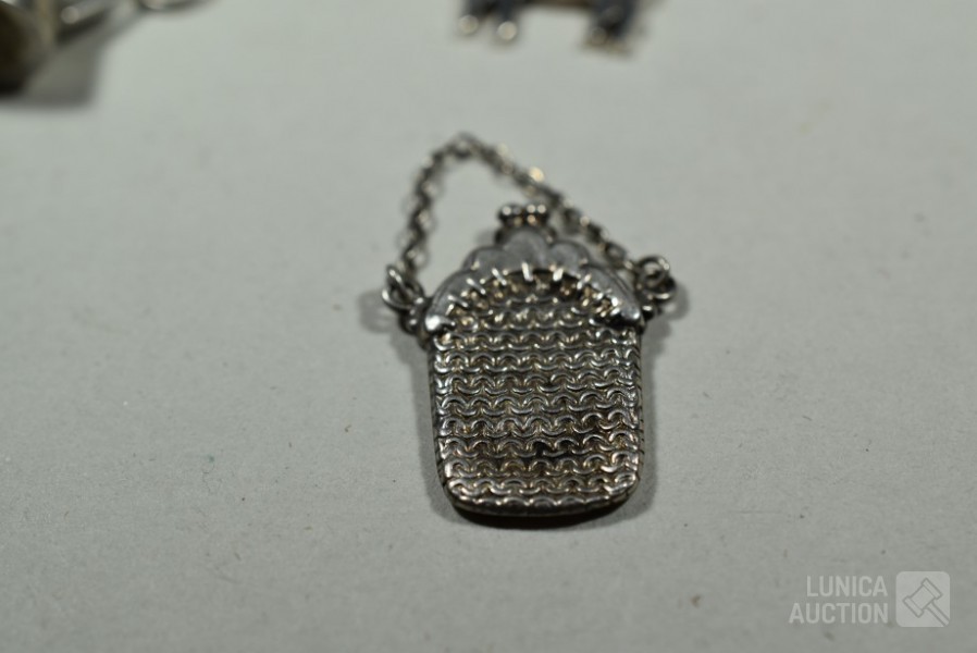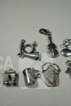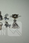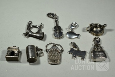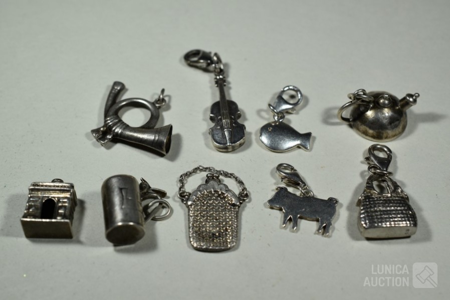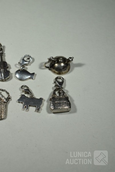 Diverse modellen o.a. "fluitketel", "posthoorn", "viool", "beugeltas", "varken Thomas Sabo", 'arc de triomph", "bierpul" enz. Allen zilver. Enkele gemerkt met 925. Afmeting ca. 10-15 mm. Totaal gewicht ca. 18 gram