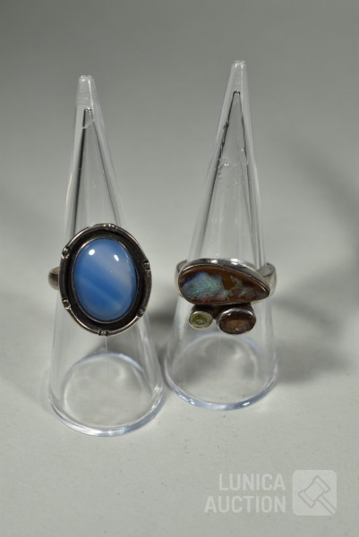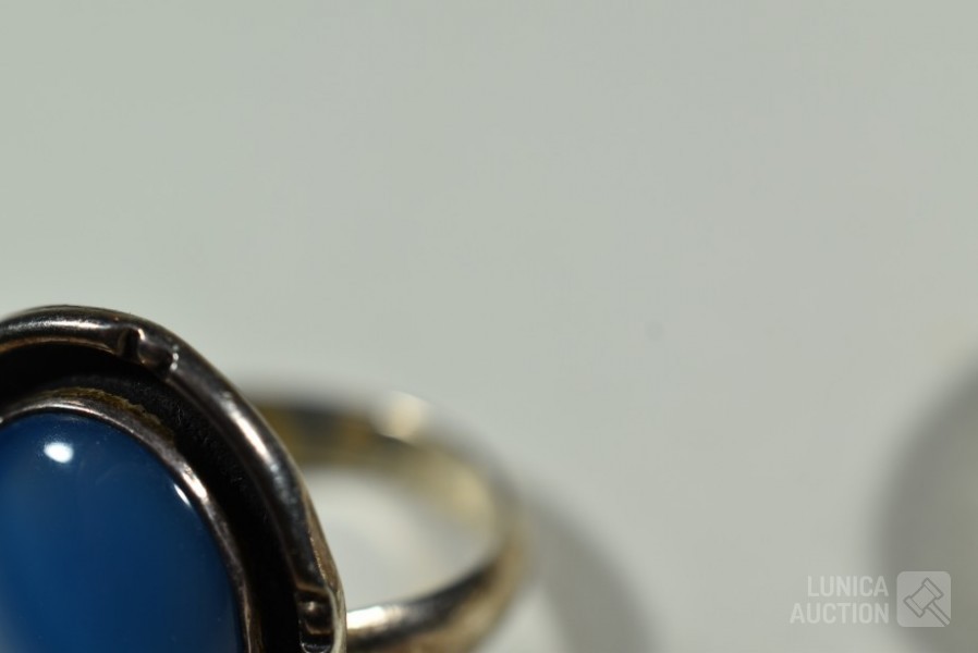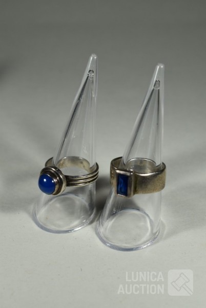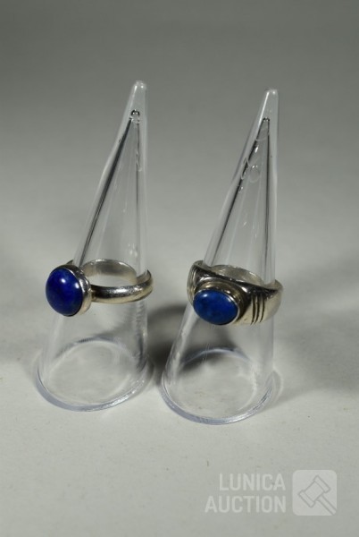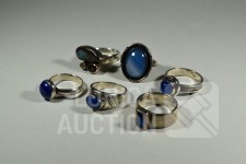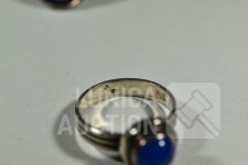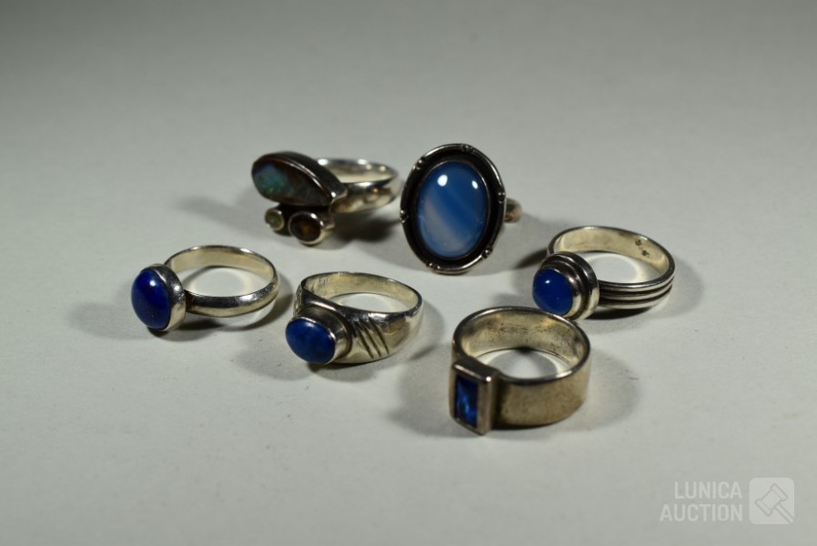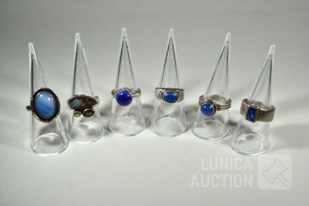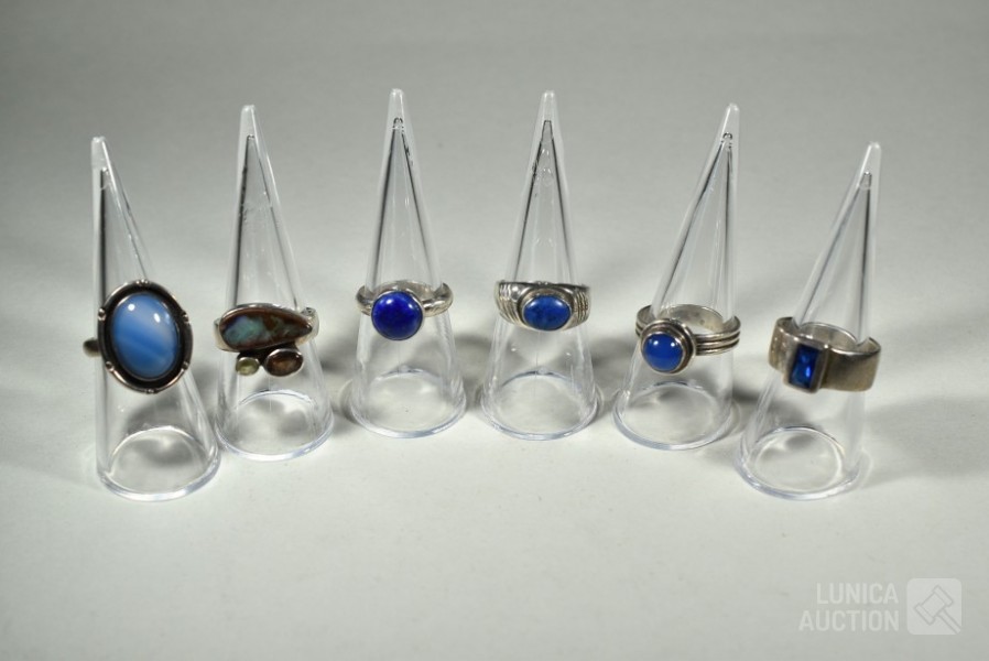 Gemerkt 5x 925, 1x niet gemerkt; Ringmaat 17 mm, 18 mm en 19 mm. Totaal gewicht ca. 34,5 gram. Met inzet van edelsteen o.a. Lapis Lazuli