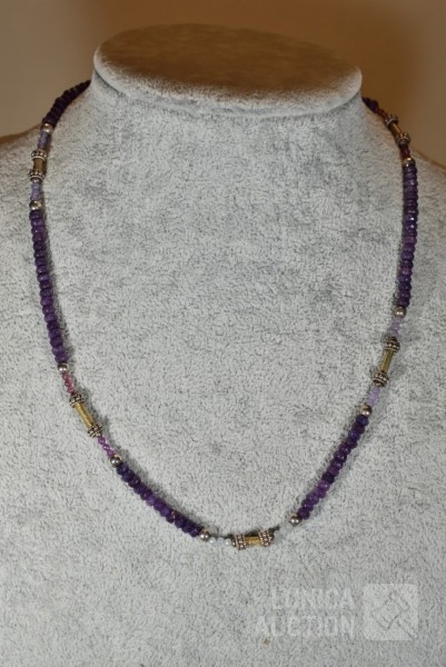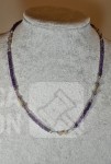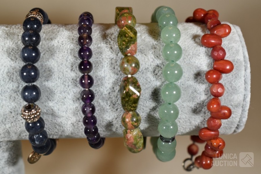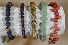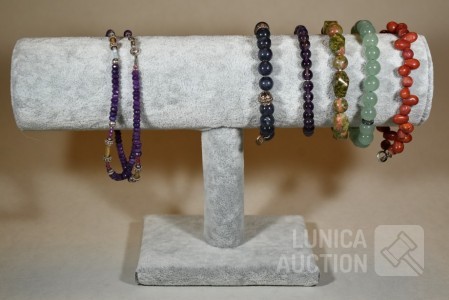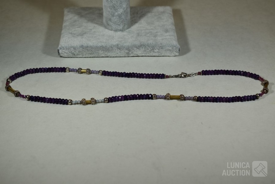 gemaakt van diverse mineraalstenen o.a. jade, bloedkoraal, amethist, unakiet enz. Lengte hanger (gesloten) 22 cm.
