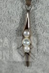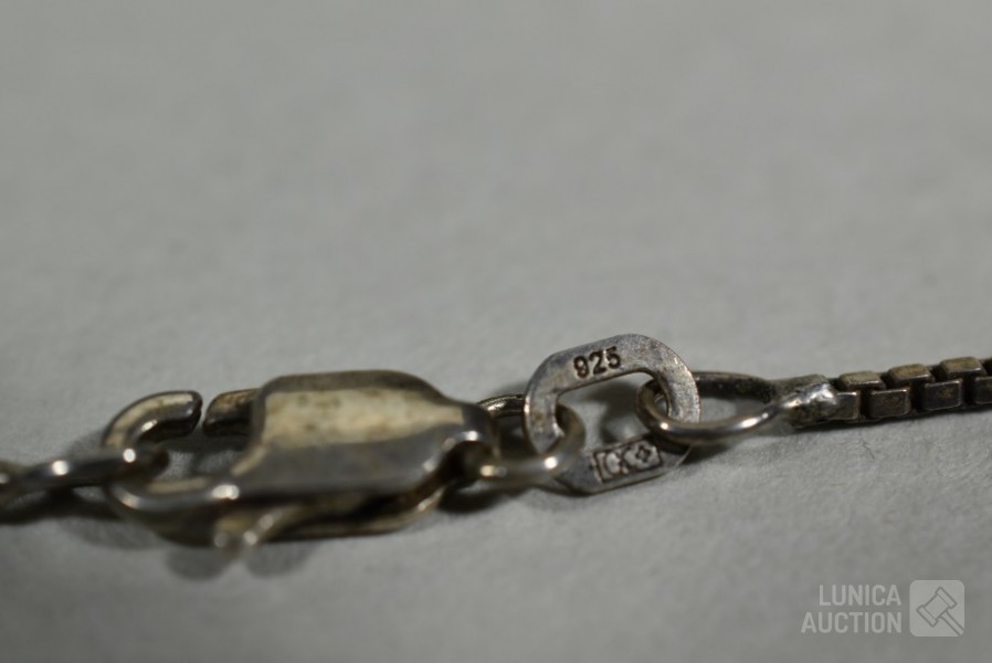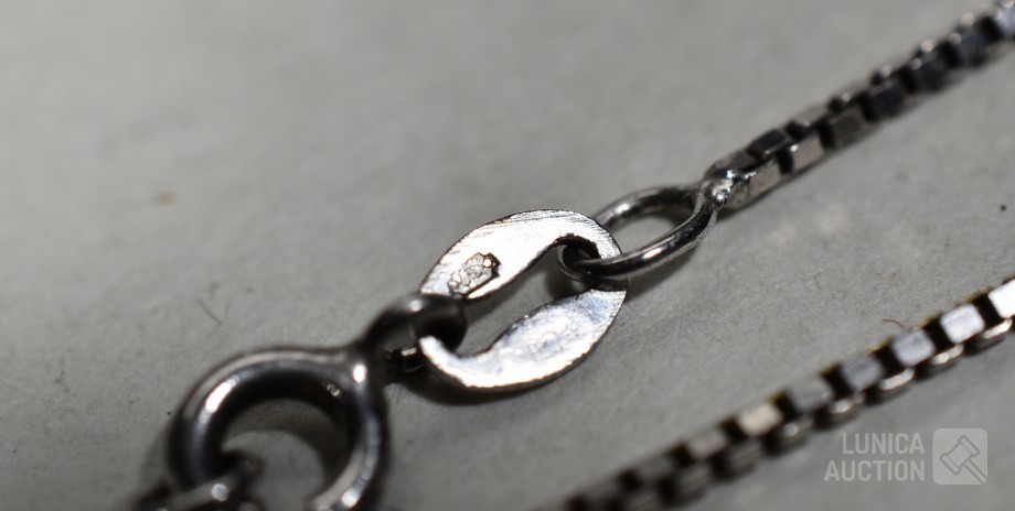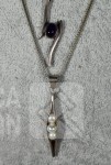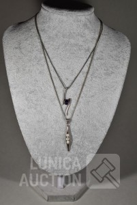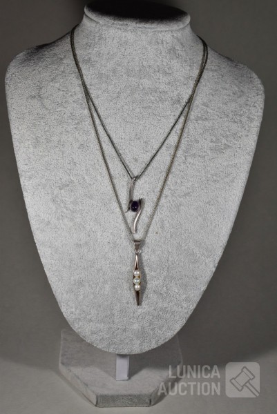 Halskettingen, gemerkt 925. lengte 40 cm en 48 cm; Hangers, niet gemerkt, laag gehalte zilver, met inzet van pareltjes en amethist Totaal gewicht 12,8 gram.