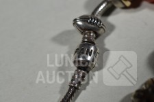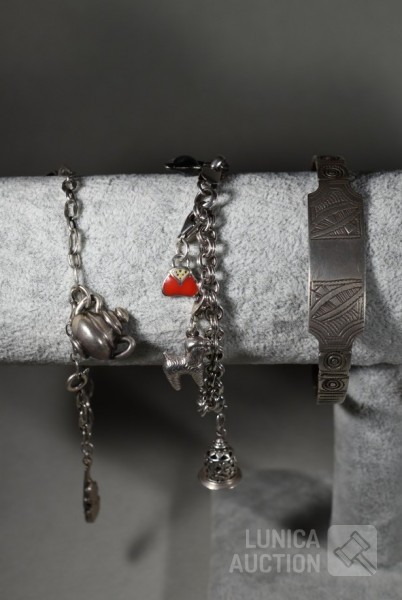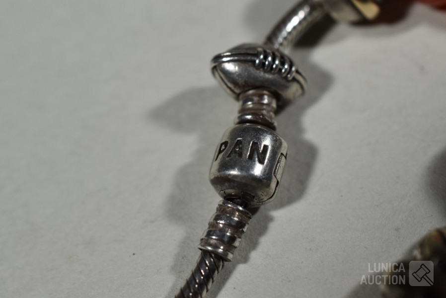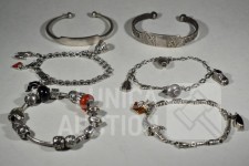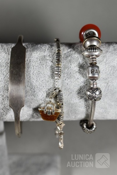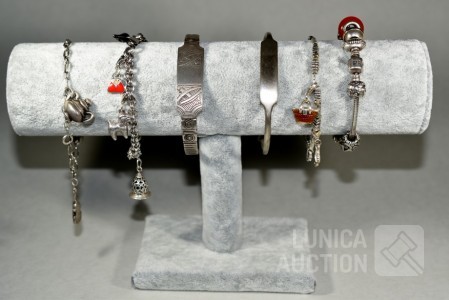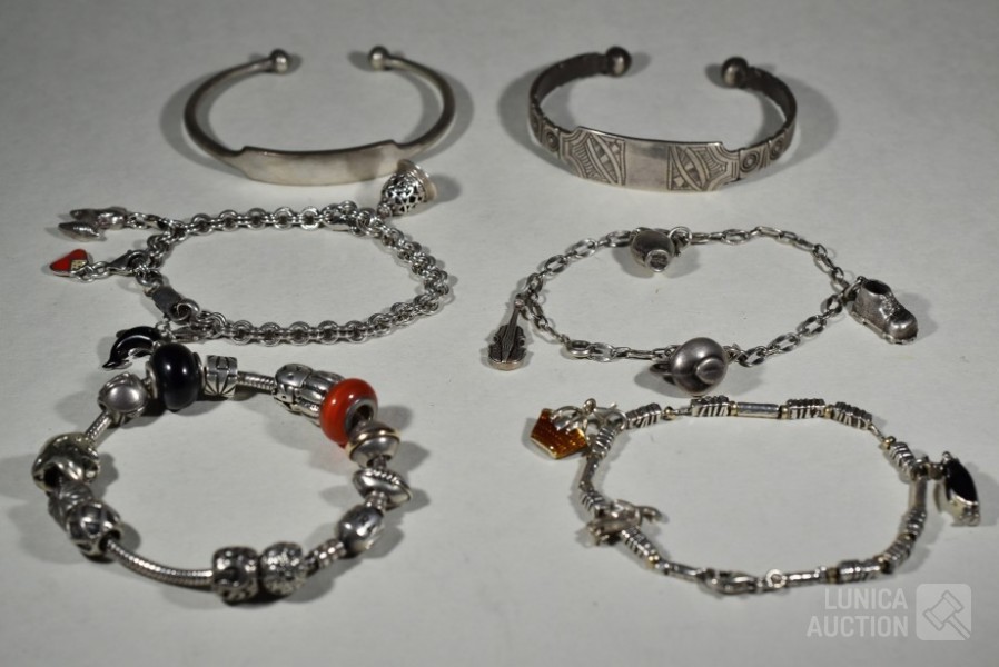 O.a. Armband met zilveren bedels, gemerkt in slot met 925; Armband Pandora, zilver, niet gemerkt; 2x klem armband niet gemerkt; Amband met bedels, gemerkt 800; Armband met bedels, gemerkt 925. Totaal ca. 150 gram.