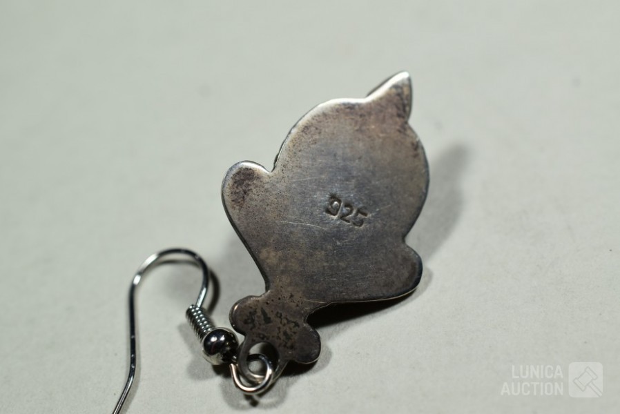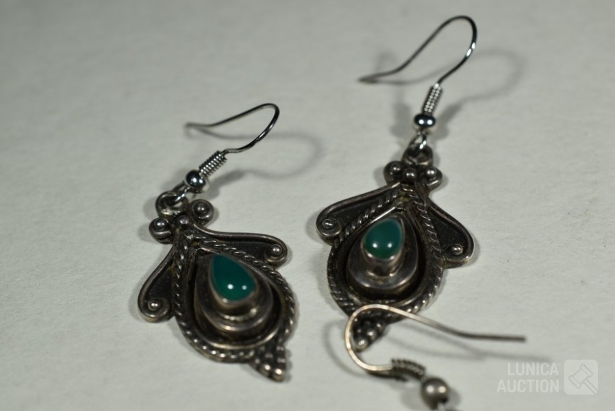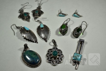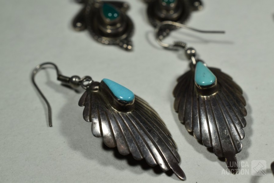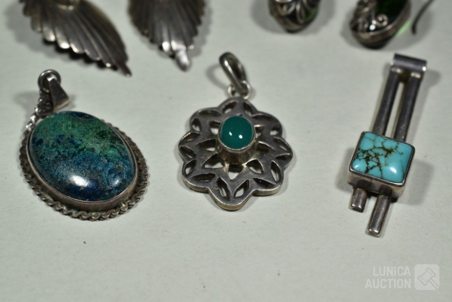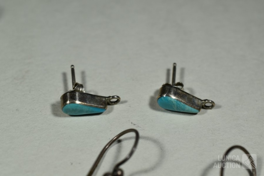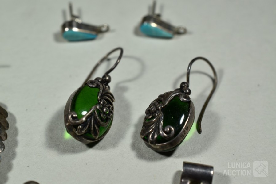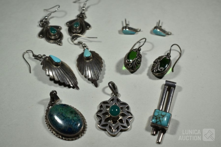 O.a. 3x set oorhangers, gemerkt met 925; 1 set oorstekers met inzet turkoois, gemerkt 925; 3x hanger met inzet, gemerkt 925; Totaal gewicht ca. 30 gram