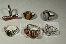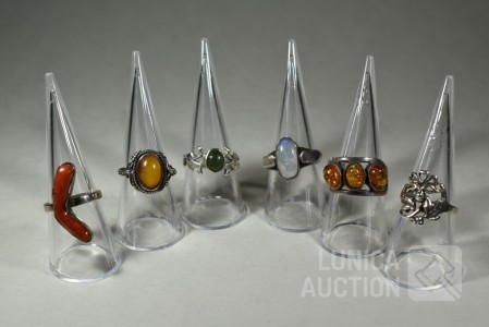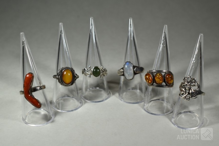 Met inzet van o.a. barnsteen, bloedkoraal enz. Ringmaat 17,5 mm, 18 mm en 18,5 mm. Alle ringen zijn niet gemerkt. Totaal gewicht ca. 25 gram.