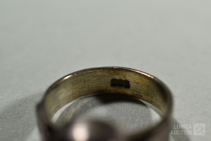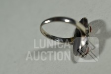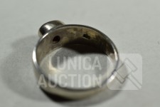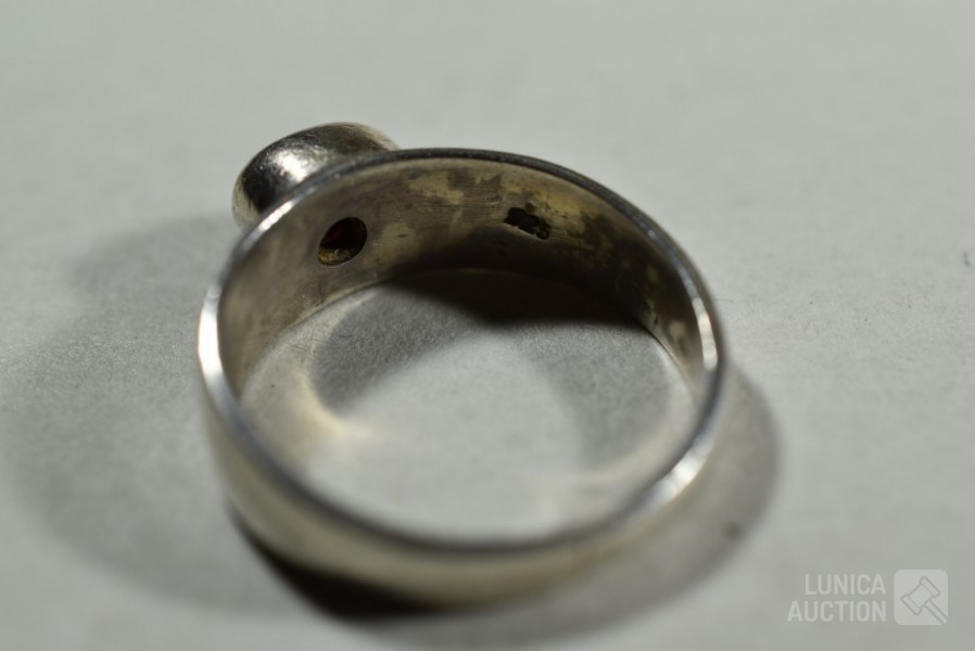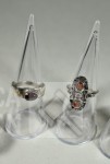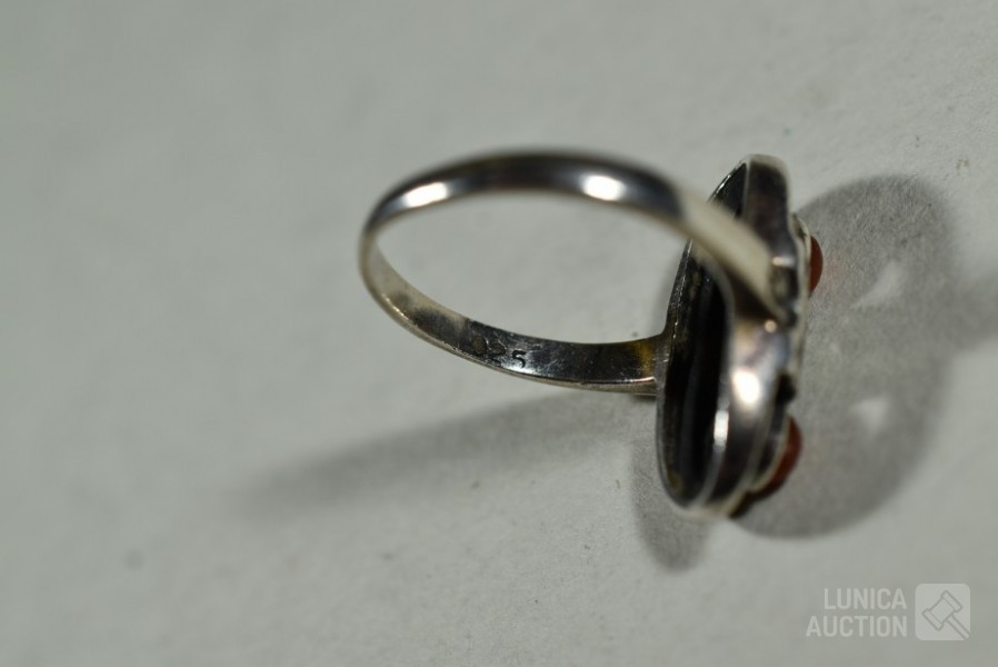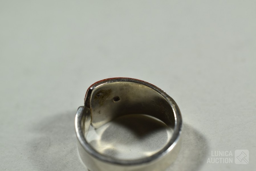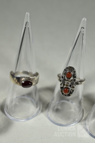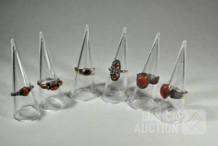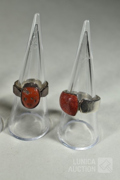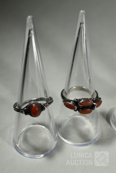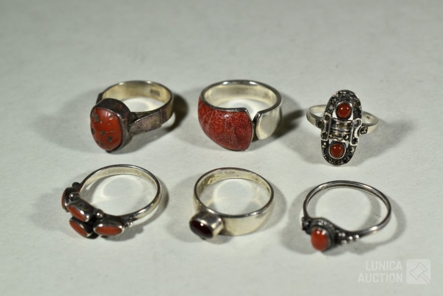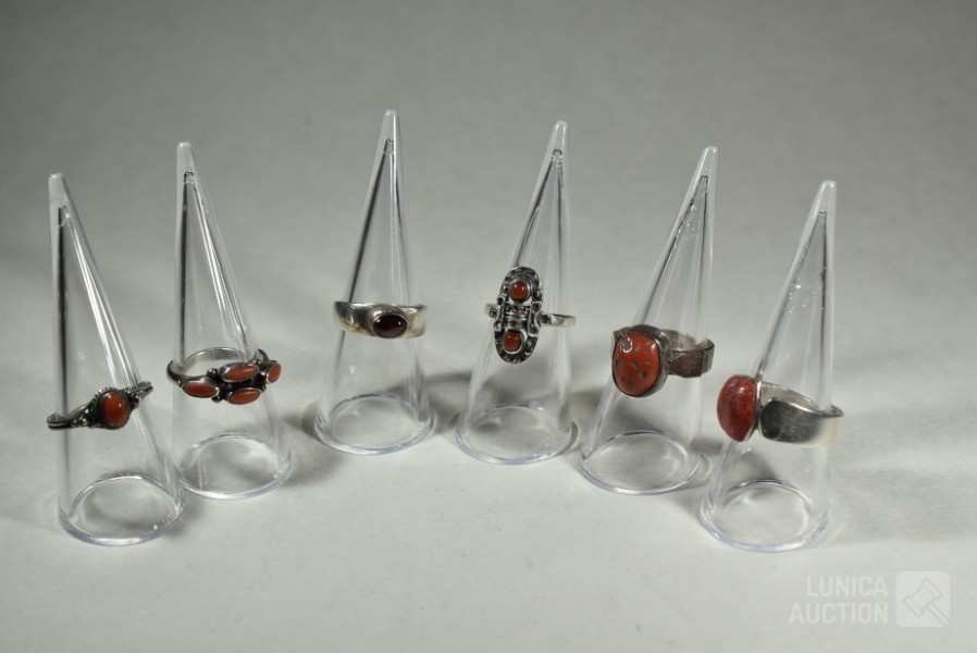 5x gemerkt met 925. 1x niet gemerkt. Met inzet van o.a. bloedkoraal. Ringmaat 16 mm, 17 mm, 17,5 mm, 18 mm en 19mm Totaal gewicht 20,5 gram.
