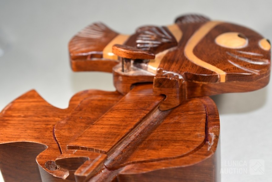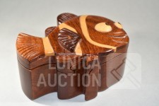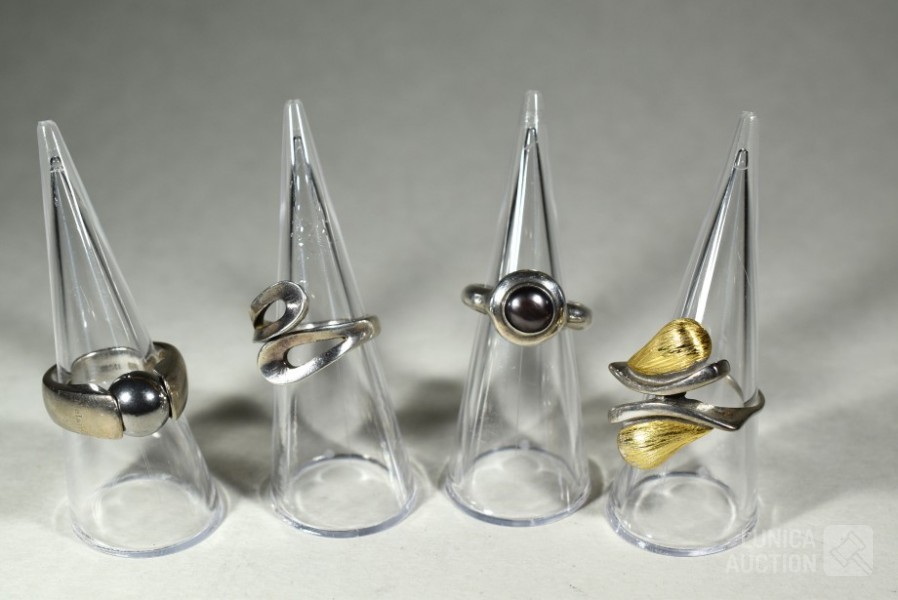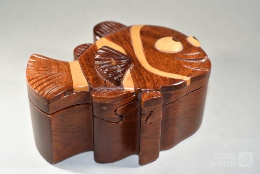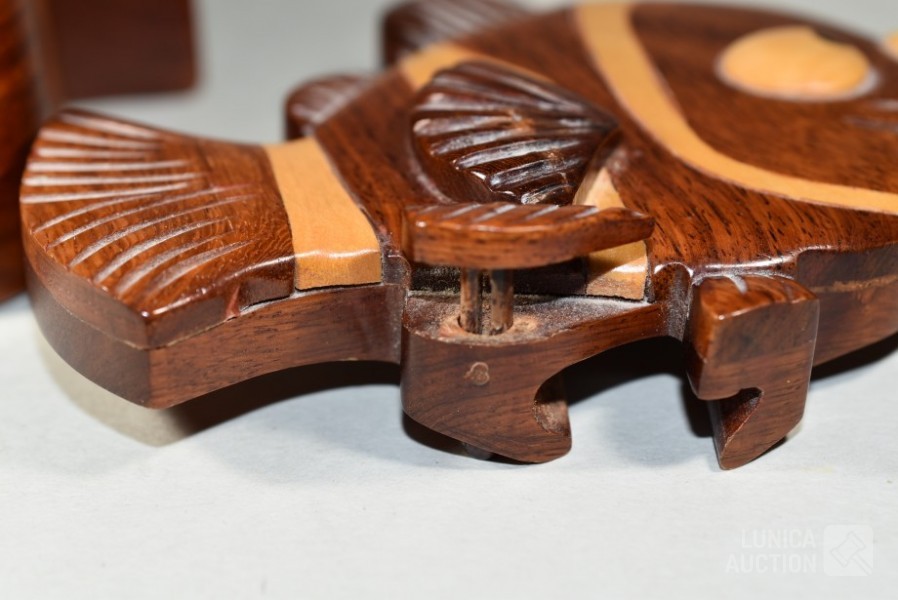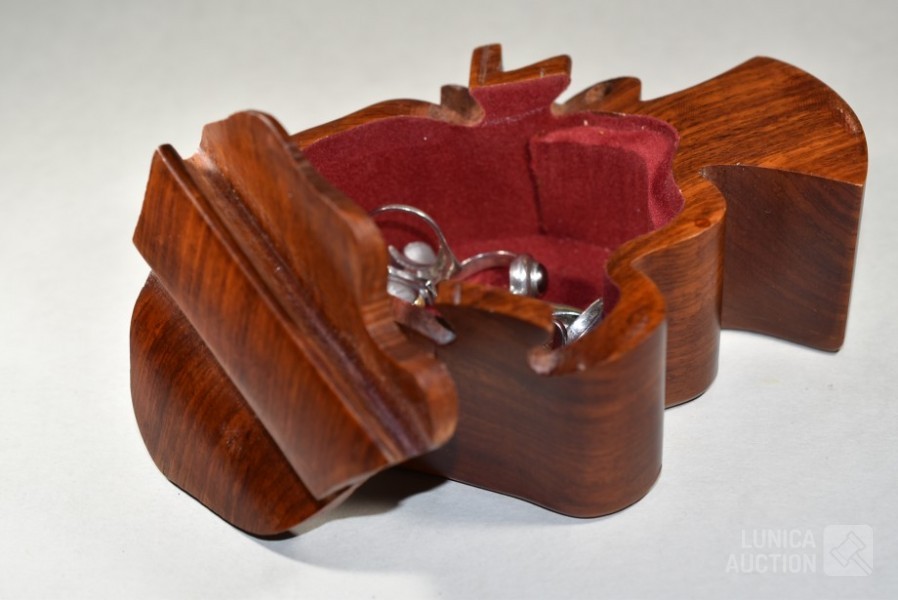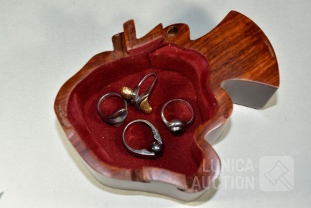 Gemerkt met 1x 925, 1x835, 2x niet gemerkt. Ringmaat 16 mm, 17,5 mm en 18 mm. Totaal gewicht ca. 30 gram. Houten juwelendoosje i.v.v vis, met verborgen sluiting, zie foto's. Meerdere houtsoorten. Afmeting (bxdxh)12x10x5 cm