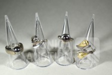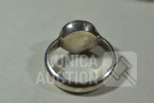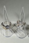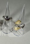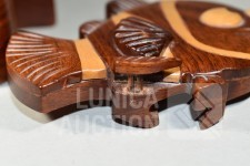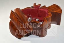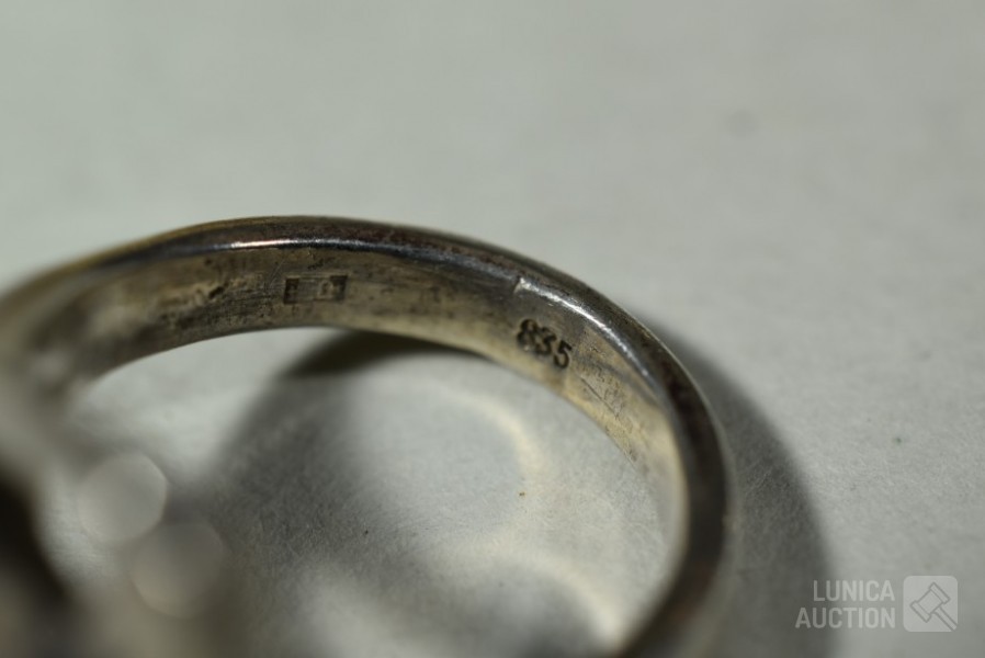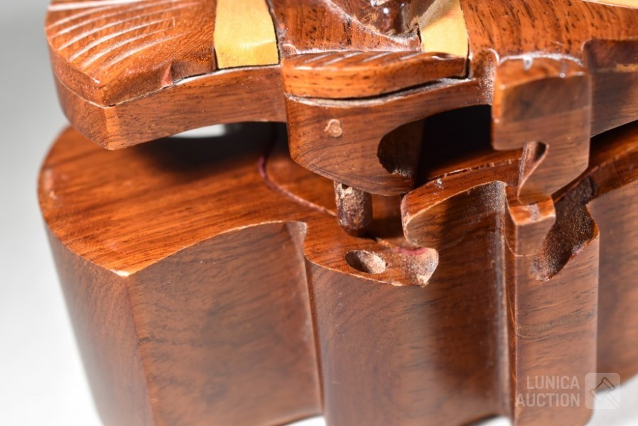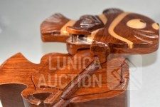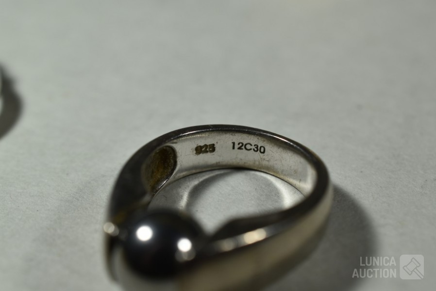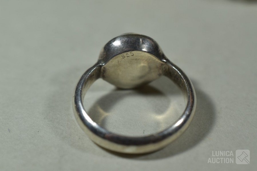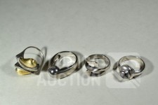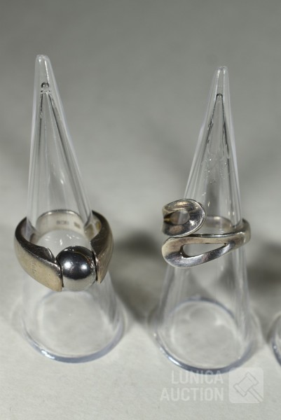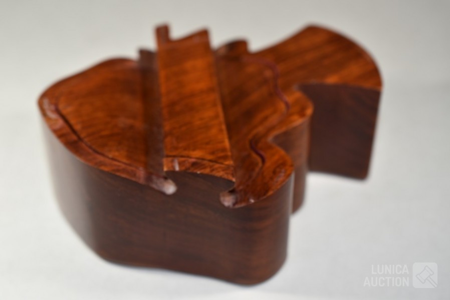 Gemerkt met 1x 925, 1x835, 2x niet gemerkt. Ringmaat 16 mm, 17,5 mm en 18 mm. Totaal gewicht ca. 30 gram. Houten juwelendoosje i.v.v vis, met verborgen sluiting, zie foto's. Meerdere houtsoorten. Afmeting (bxdxh)12x10x5 cm