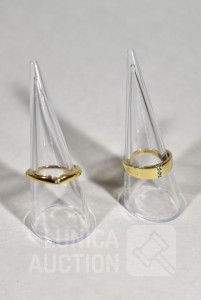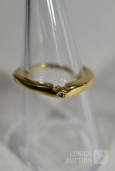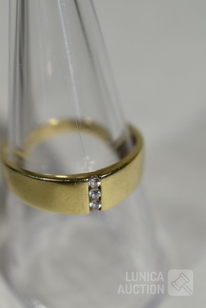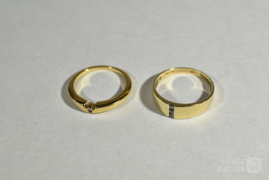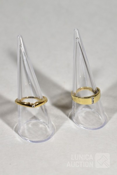 Ring gemerkt 585, ringmaat 18,5 mm, met inzet van 3 briljantjes. Gewicht 2,5 gram; Ring, goud 333, niet gemerkt, met inzet van briljantje, ringmaat 17,5 mm. Gewicht 2,0 gram