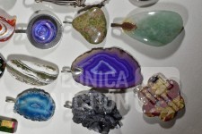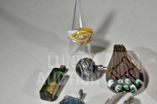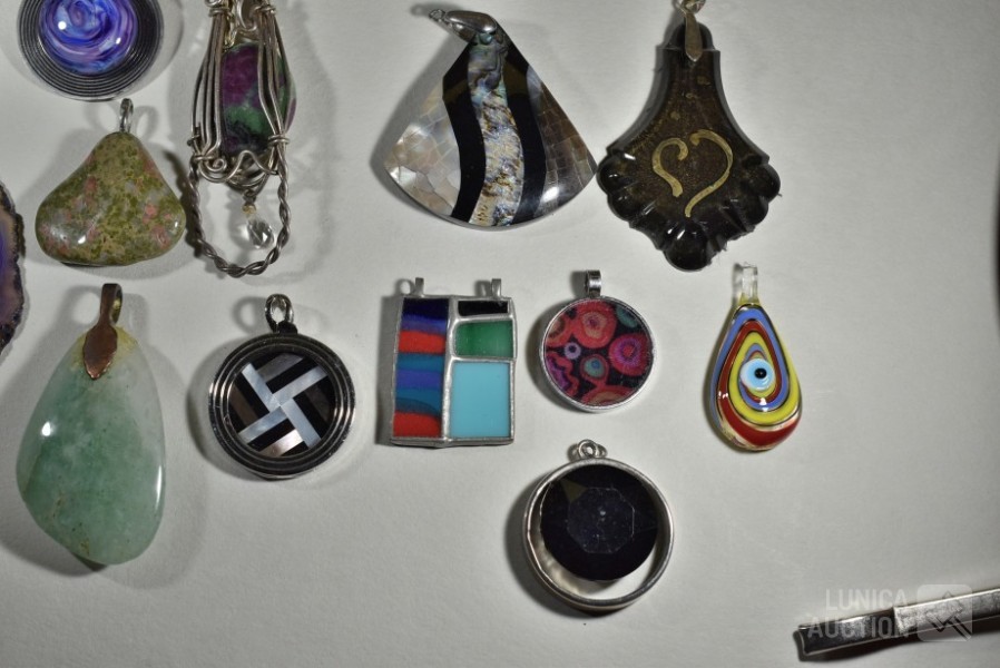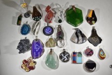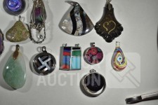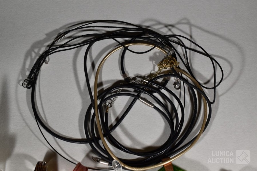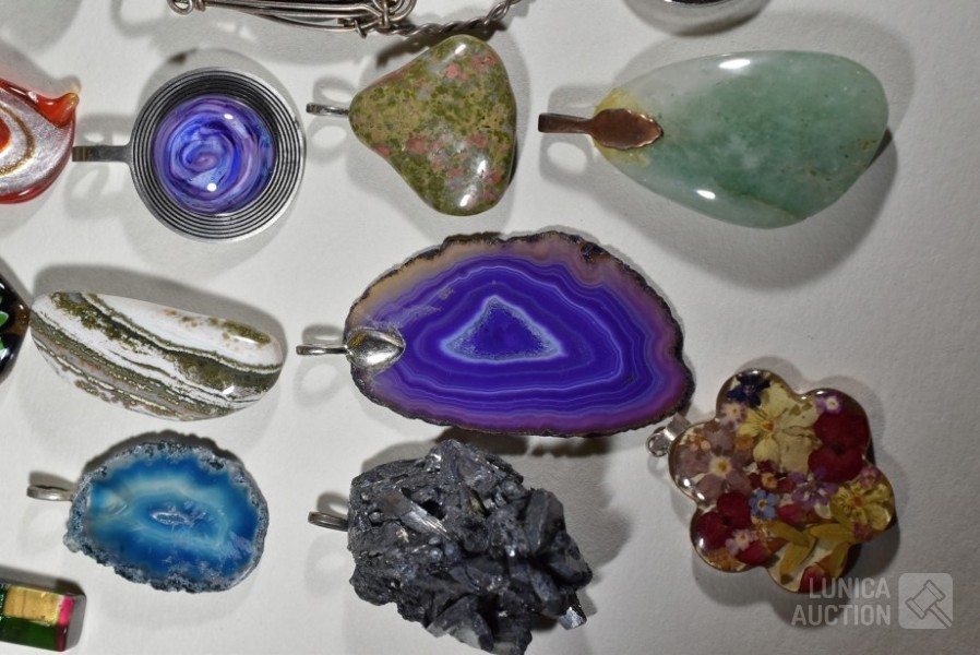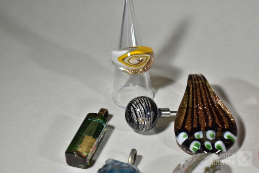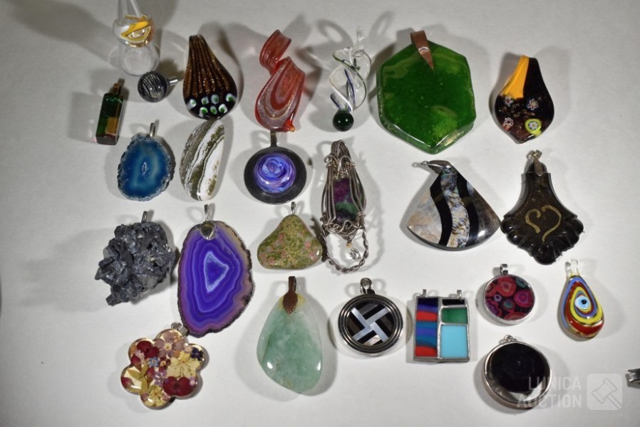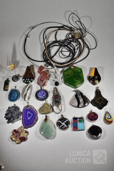 Gemaakt van diverse materiaal soorten zoals (meerkleurig) glas, natuursteen, mineraalsteen enz. Inclusief glazen ring en ca. 9 halskoorden voor hangers gemaakt van diverse materialen. Totaal gewicht ca. 500 gram. Diverse modellen