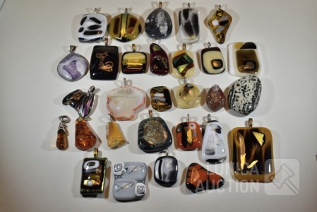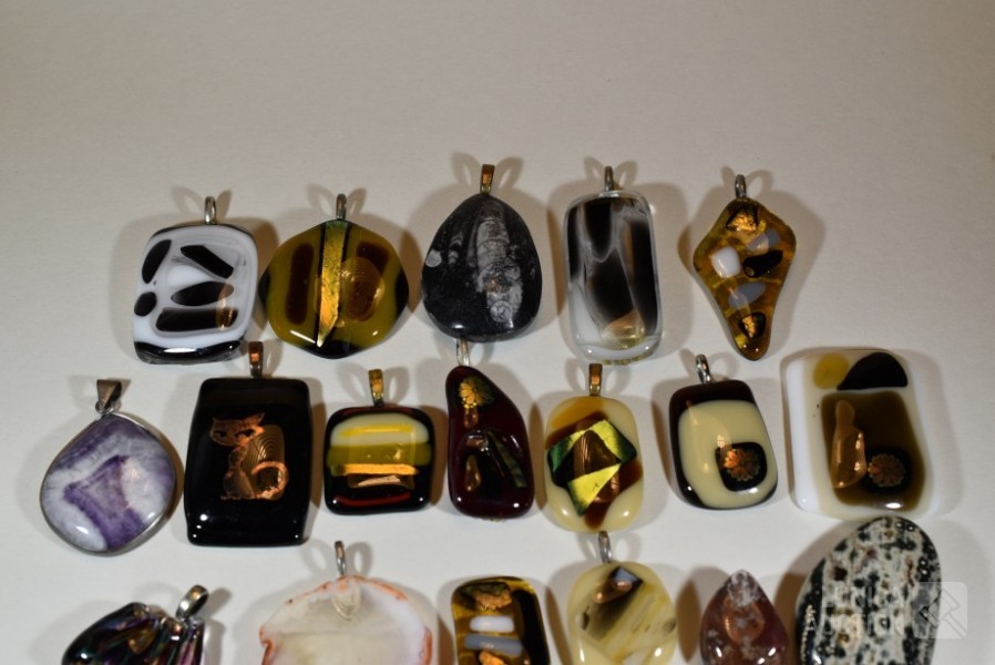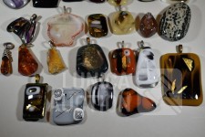 Gemaakt van diverse materiaal soorten zoals (meerkleurig) glas, natuursteen, mineraalsteen enz. Inclusief enkele losse stenen. Totaal gewicht ca. 500 gram. Diverse modellen. Afmeting variërend van 10x30 mm tot 40x60 mm.