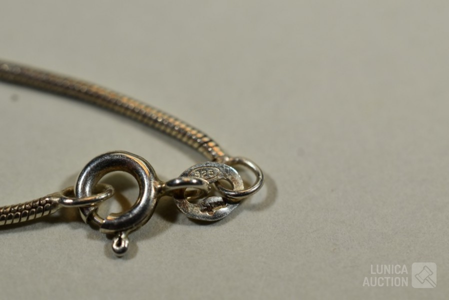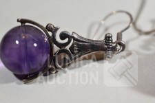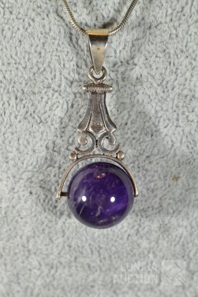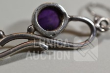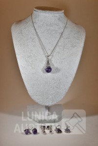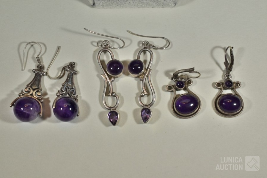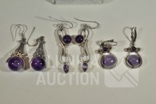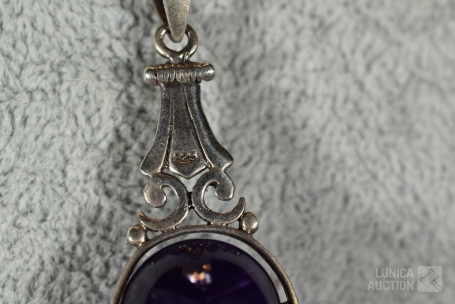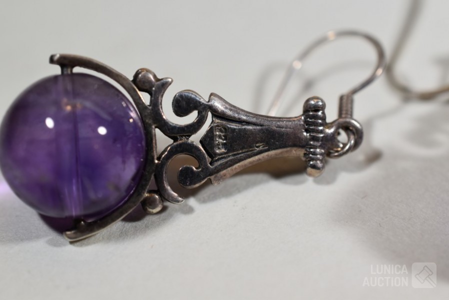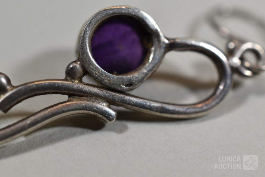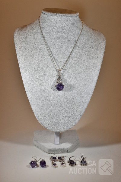 Halsketting, hanger en 2 sets oorhangers gemerkt 925. Één set oorhangers is niet gemerkt. Met inzet van amethist. Totaal gewicht ca. 36 gram