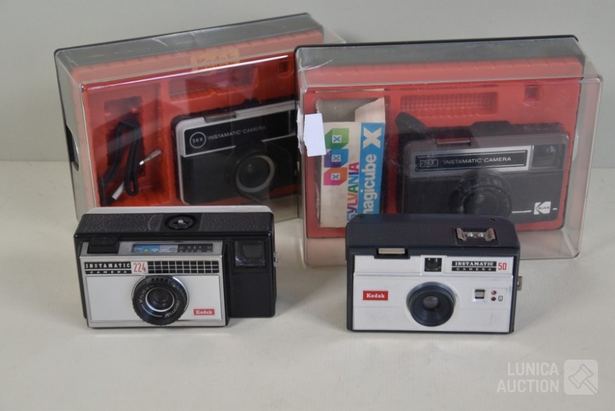 Instamatic 224; Instamatic 76x; Insatmatic 56x; Instamatic 50; 2x in originele box. Inclusief 2x Sylvania magicube X flitslamp.