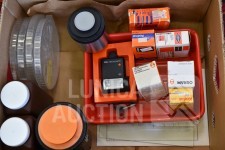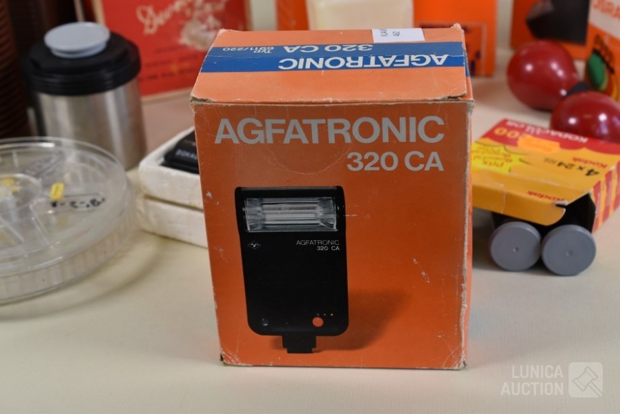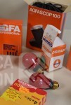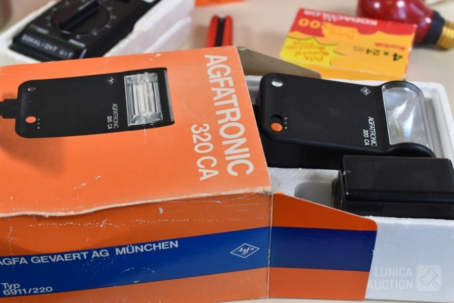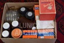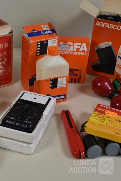 o.a ontwikkeltanks, rode lampen, Agfascop 100, Agfatronic 320 Ca, Agefix, AGFA rodinal negativ gesloten verpakking, Tetenal Schweffeltoner geruchlos gesloten verpakkingen, 2x Agfa professional Brovira speed BH 319 PE waarvan één gesloten verpakking, enz. Deze kavel wordt niet per pakketdienst verzonden i.v.m. aanwezigheid van chemische vloeistoffen.
