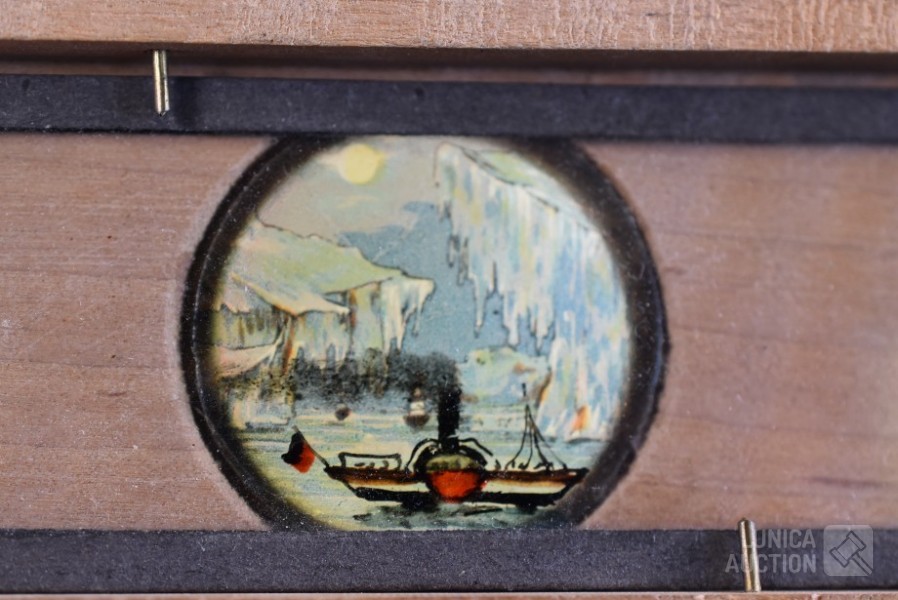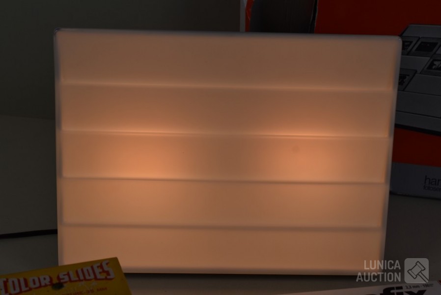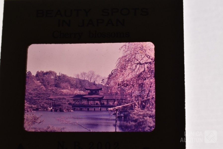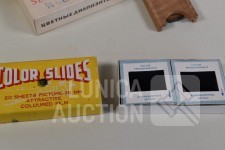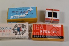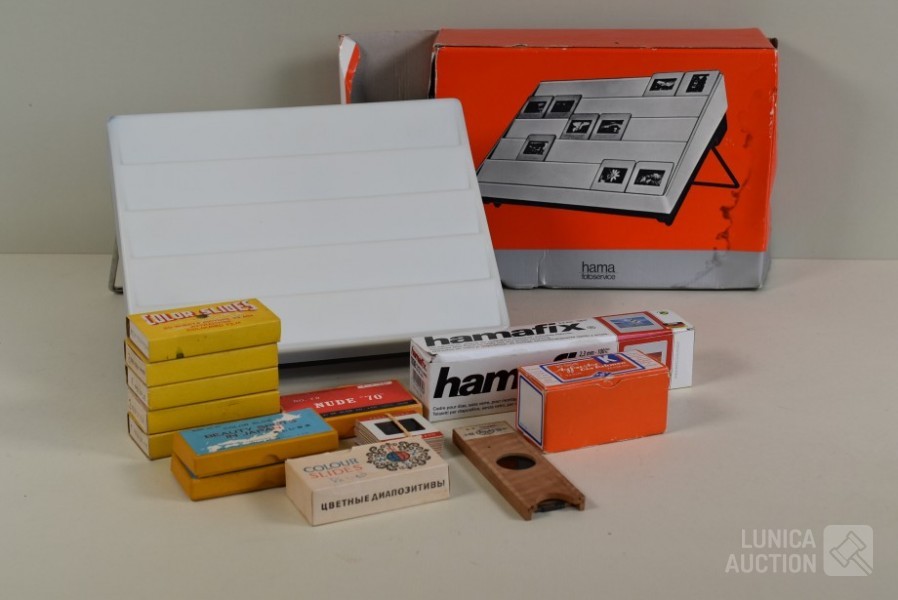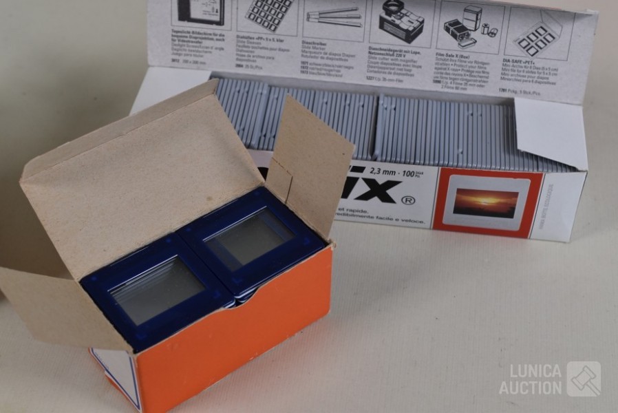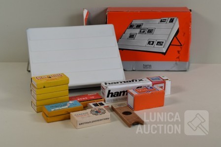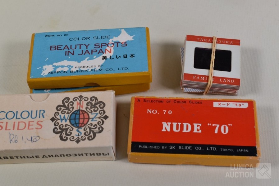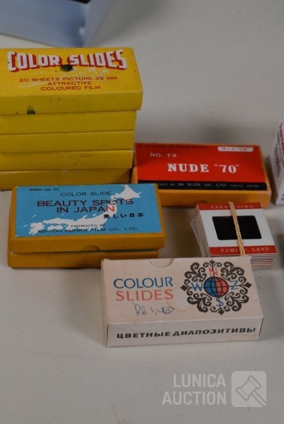 O.a. ca. 8 vintage dia series (ca. 130 stuks dia's/"color slides") zoals "Beauty spots in Japan", "Nude "70"",: New territory", "People", "Tiger balm garden", enz. Het is niet bekend of series compleet zijn ; "Laterna magica" schuifbeeld, "Polargegend nummer 36" in houder; Lege diaramen; HAMA sorteerraam enz.
