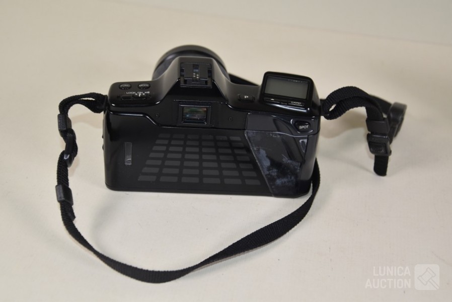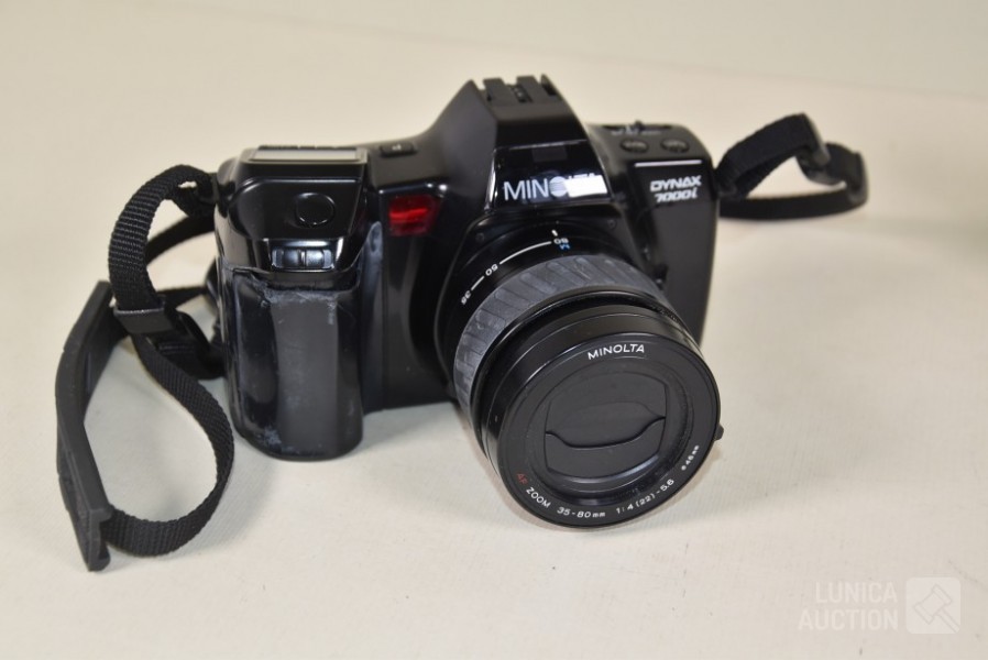 Minolta Dynax 7000I, met objectief AF zoom 35-80 mm 1:4(22)-5.6, Ø 46 mm. Handvat is beschadigd.; Minolta HI-matic G2 met minolta lens, 38 mm 1:2.8 Ø 46 mm