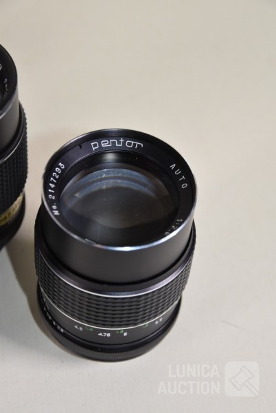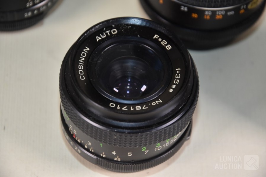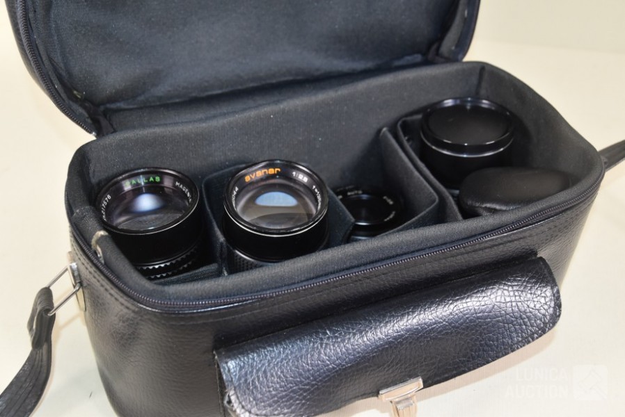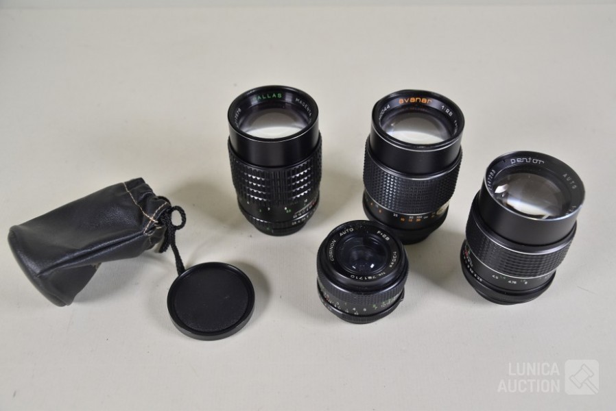 O.a. PALLAS Magenta AM 1:2.8 f=135 mm Ø55 mm; AVANAR 1:2.8 f=135 mm Ø 55mm; COSICON Auto F=2.8 f=35 mm; PENTOR Auto 1:2.8 f=135 mm; Inclusief opbergtas.