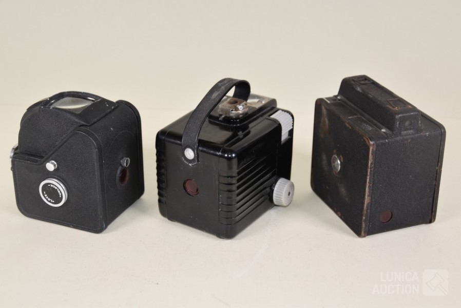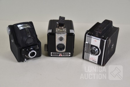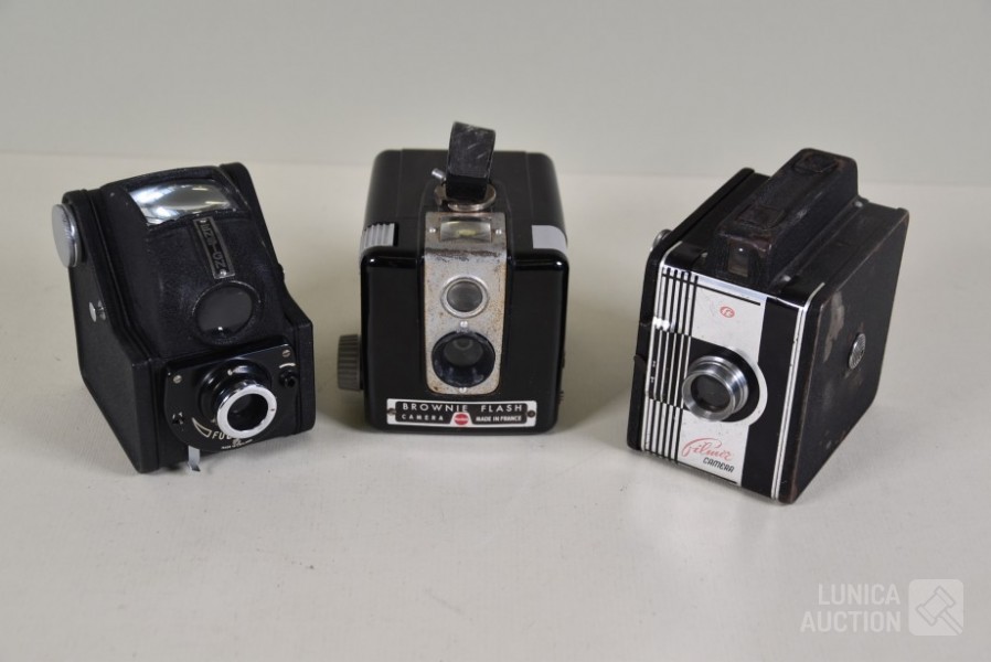 O.a. Kodak Brownie Flash camera; Vintage Filmore Eye-Level camera; Ensign Ful-Vue camera.